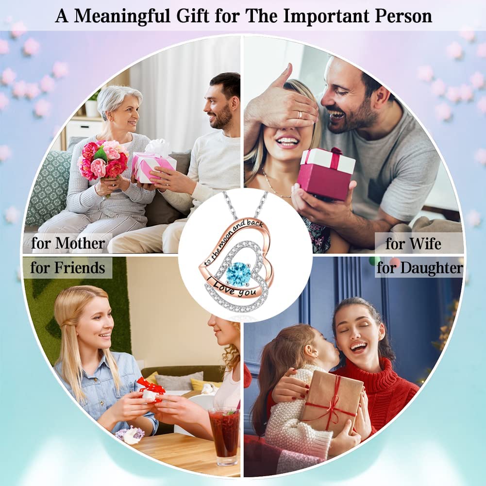 ?【DESIGN CONCEPT】 The double hearts are interlocked, representing the bond of close love between lovers, and can also represent the meaning of family unity. This necklace can contain the love for the family, the love for the lover, the words "I love you to the moon and back" highlight the deep love for the wife / family. The center is set with birthstones representing different months, which better reflects your special love.