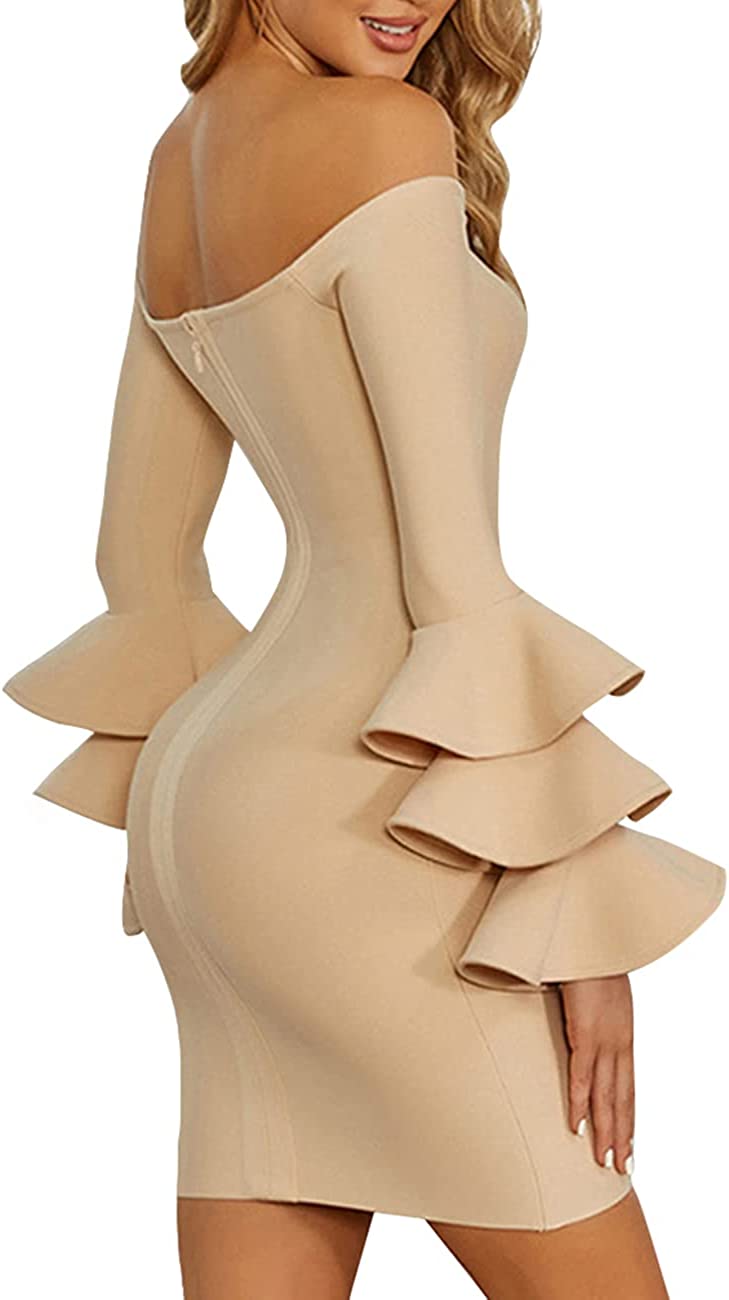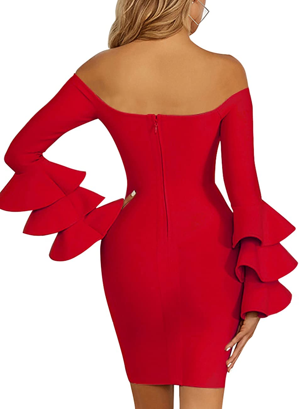 Features:This bandage dress features stylish ruffle flared long sleeve,off shoulder with anti-slip strip,hidden zipper closure,bodycon tight fit,flattering knee length cut