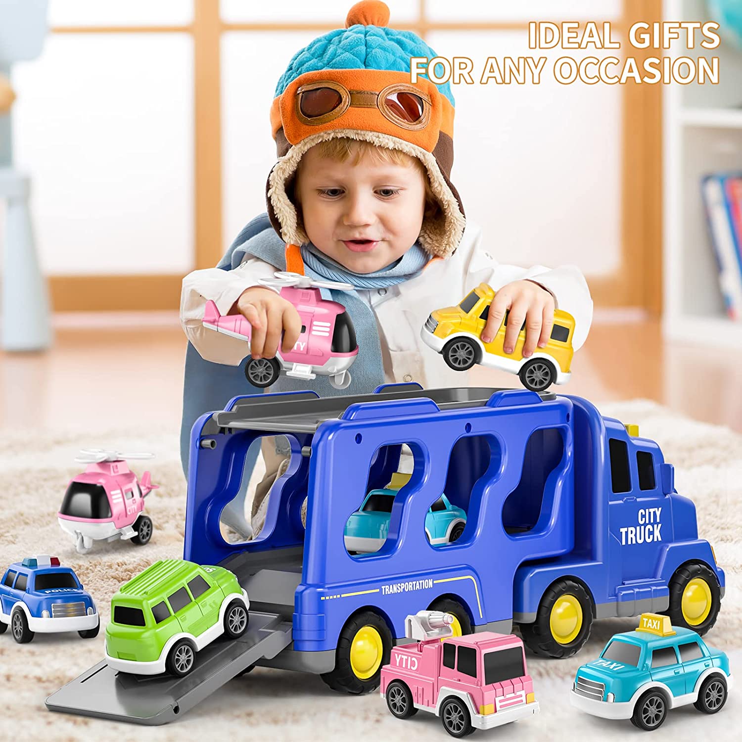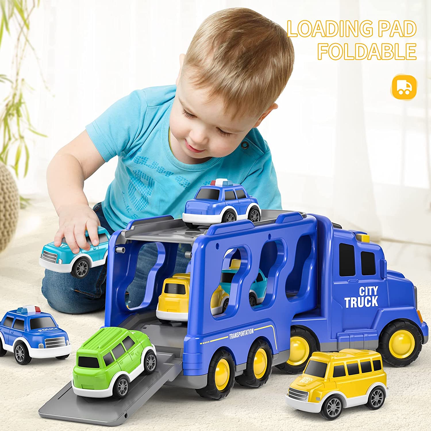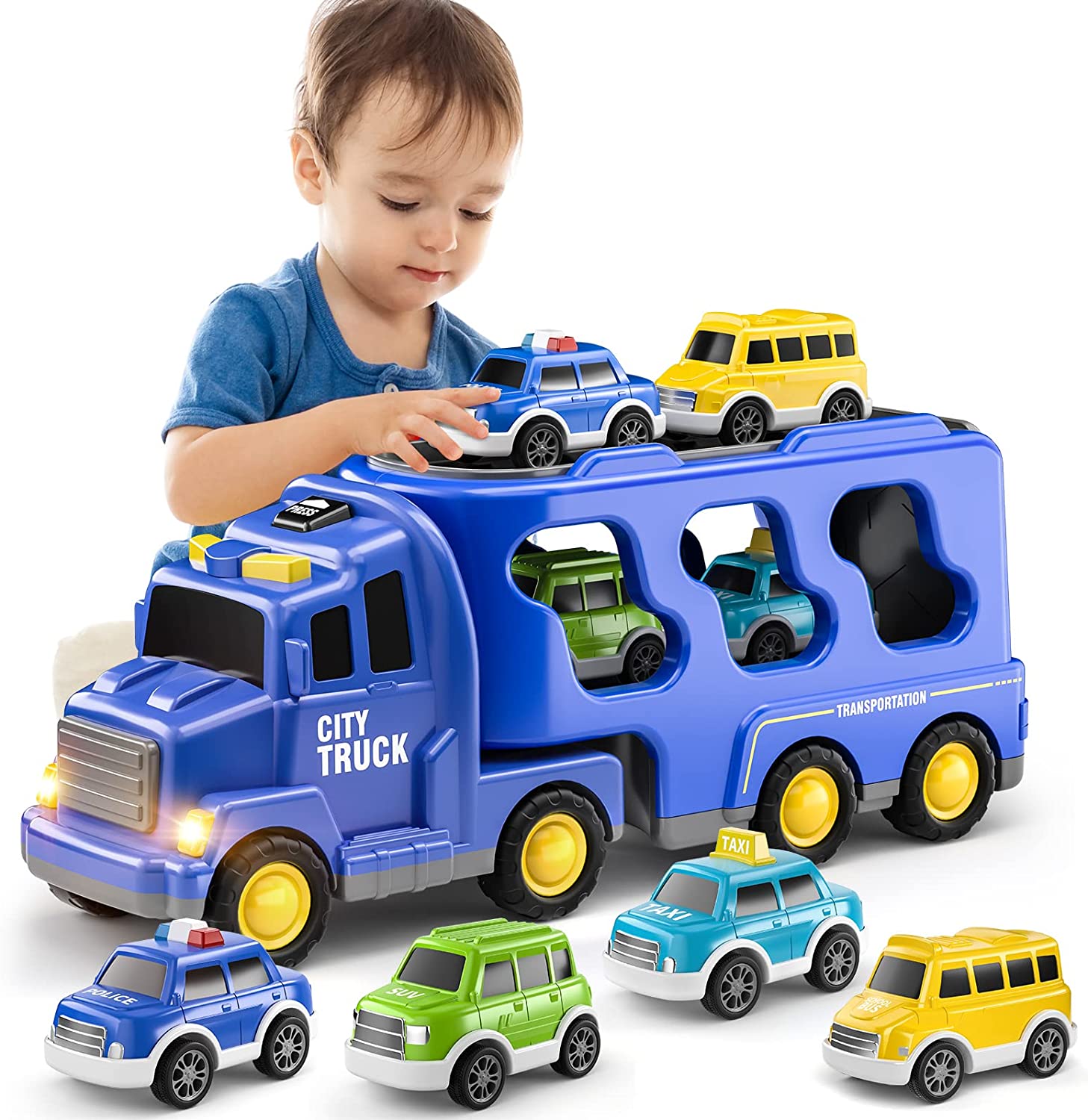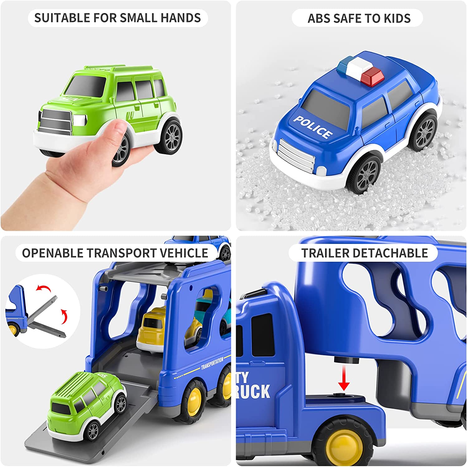 5 IN 1 CARTOON VEHICLE TOY: This transport city car truck set includes a larger carrier truck and 4 small school bus, taxi car, police car and SUV. It is highly recommended for kids aged 3 and above to create endless happy times!