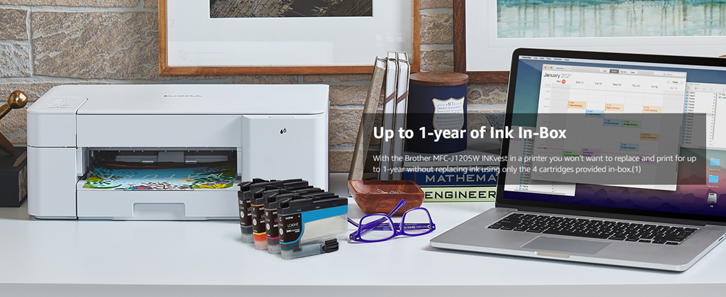 Get ready for a productive day with help from this Brother printer. The wireless printer offers easy mobile printing options, a Hi-Speed USB 2.0 interface and web-based printing for versatility. The color printer features a 150-sheet input tray to help your team print big jobs without having to constantly refill it. NO INK REPLACEMENT FOR UP TO 1-YEAR(1): Experience truly uninterrupted printing, exceptional savings and super convenience with up to 1-year of ink using only the four cartridges provided in-box.(1) PUT THE POWER OF PRINTING AT YOUR FINGERTIPS: The simple to use Brother Mobile Connect(2) App delivers easy onscreen menu navigation for printing, copying, scanning and printer management from your mobile device. BROTHER REVOLUTIONARY INKVESTMENT TANK SYSTEM: Brother INKvestment Tank printers feature reengineered ink cartridges that hold more ink than traditional cartridges and deliver a continuous ink supply for truly convenient, uninterrupted printing. ELIMINATE INK REPLACEMENT GUESSWORK: Print with confidence using the Brother Page Gauge,(3) a visual, numerical way to know the amount of ink used and the amount of ink remaining to help take the guesswork out of when to replace ink. USE BROTHER GENUINE INK: Engineered to work with INKvestment Tank inkjet printers, a full range of INKvestment Tank cartridges is available that deliver high quality prints and reliable page yields: LC404BK, LC404C, LC404M, LC404Y and LC404 3PK. BROTHER AT YOUR SIDE. Brother offers a 2-Year Limited Warranty and At Your Side support for the life of your printer. REFRESH: Buy Genuine Brother Ink Cartridges. When you do need to replace your ink supply, choose Brother Genuine LC404 inks. To avoid worrying about running out of ink again, get started with Refresh EZ Print Subscription service and save up to 50% on ink(5). DISCLAIMERS: (1)Based on average monthly print volumes of approx. 100 pages at 60% black/40% color pages in accordance with ISO/IEC 24711 using 4 cartridges