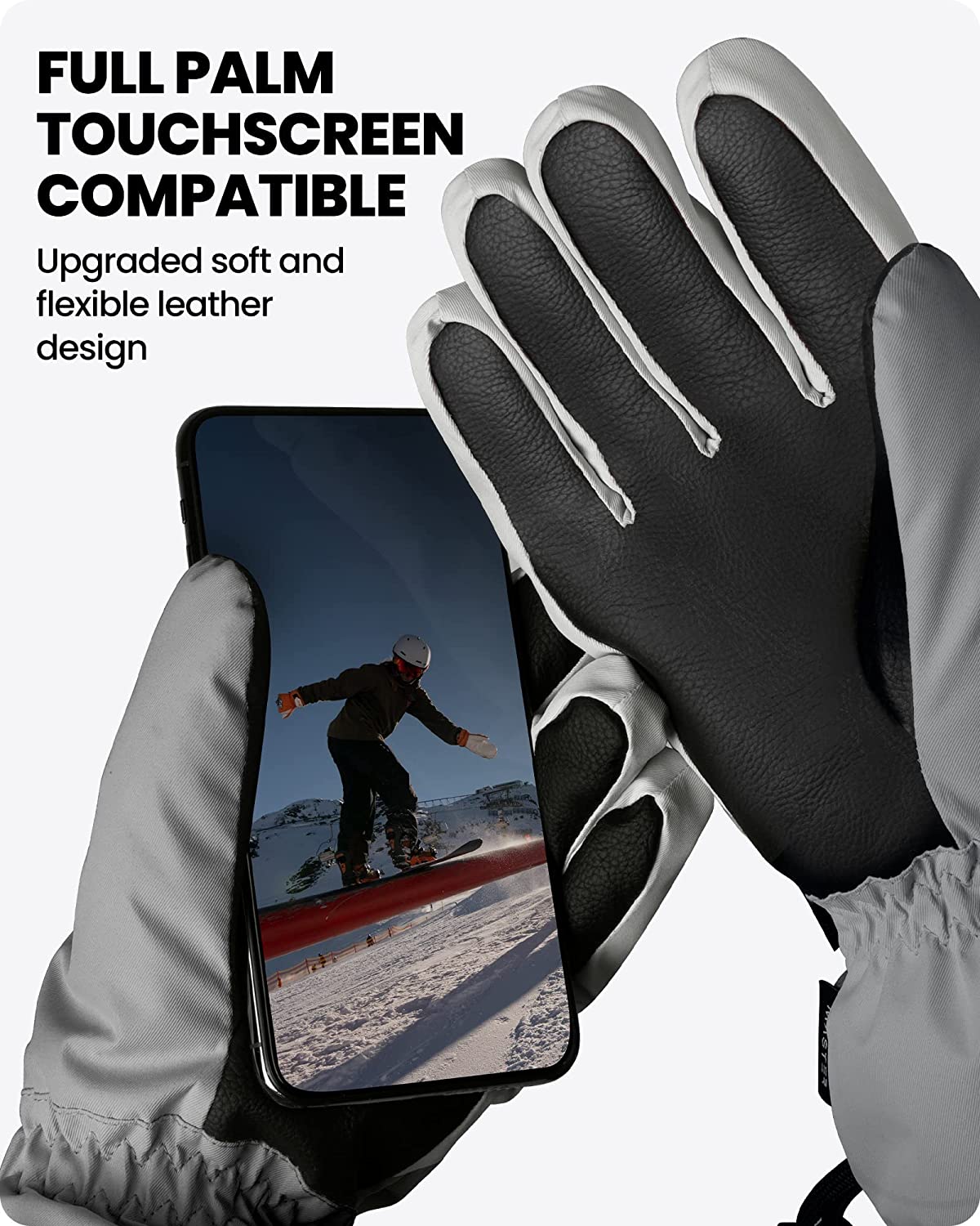 FULL PALM TOUCHSCREEN COMPATIBLE - Upgraded soft and flexible leather provide the full palm touchscreen function for the skiing mittens. You can easily access to your smart devices, using it during outdoor activities without taking off the gloves in the cold winter.
