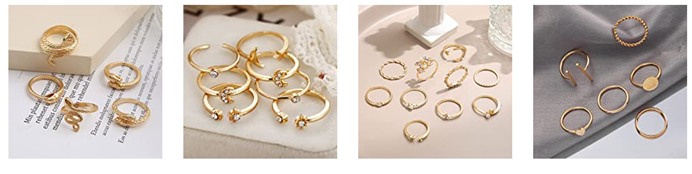 You will get down stacking ring set,these rings contain various fashion elements;butterfly, snake, star, moon...