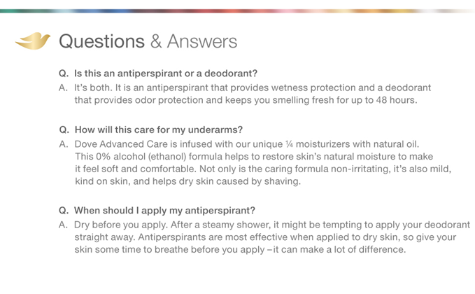 With Dove Advanced Care Invisible Sheer Fresh Antiperspirant Deodorant Stick, you can step out in style. This antiperspirant deodorant for women is proven to be invisible on 100 colors of clothing. Giving you long-lasting protection against underarm sweat and odor, this non-irritating antiperspirant for women will leave your underarms feeling healthy and protected for up to 48 hours. Enriched with our signature 1/4 moisturizers with natural oil, this antiperspirant gives you a dose of underarm care. Its 0 percent alcohol (ethanol) formula helps reduce irritation from shaving and leaves you with the fresh scent of cucumber with notes of freesias, lily and rose. Use Dove women's deodorant regularly and you can enjoy beautifully soft and comfortable underarms that stay dry all day long. For best results, swipe your antiperspirant deodorant stick up and down each underarm until an even layer is applied. Apply this Dove antiperspirant deodorant to dry skin after showering and enjoy fresh, comfortably dry skin from morning to night. Dove is certified cruelty-free by PETA because we believe that real beauty is cruelty-free. We’re on a mission to help women raise their self-esteem – because we believe beauty should be a source of confidence, not anxiety. Dove Antiperspirant Deodorants deliver effective underarm protection and are kind to skin, so women can be free of underarm inhibitions and live beautifully unselfconsciously.