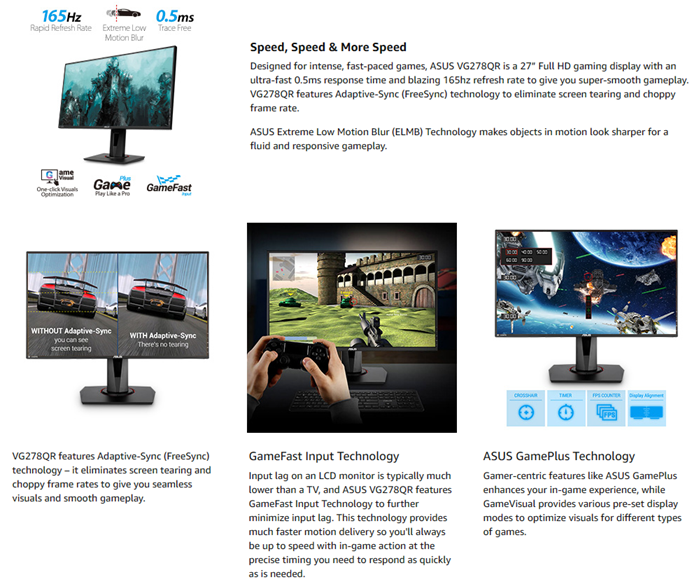 Make every millisecond count with the 27” VG278QR gaming monitor featuring a 165Hz refresh rate and 0.5ms response time with Asus’ ELMB technology to reduce motion blur with free Sync and G-SYNC compatibility Turn any desk into a marathon battle station with vg278qr’s ergonomic adjustable stand and eye Care technology. Dimension without Stand (WxHxD): 24.37 inches x14.29 inches x 1.96 inches.