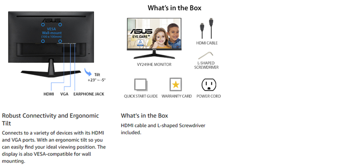 The 23.8” VY249HE monitor is equipped with ASUS BacGuard, a ionic silver treatment applied on the midframe for a more sanitary surface. With Eye Care Plus, the VY249HE features additional color augmentation and rest reminder modes for a more user-friendly experience.