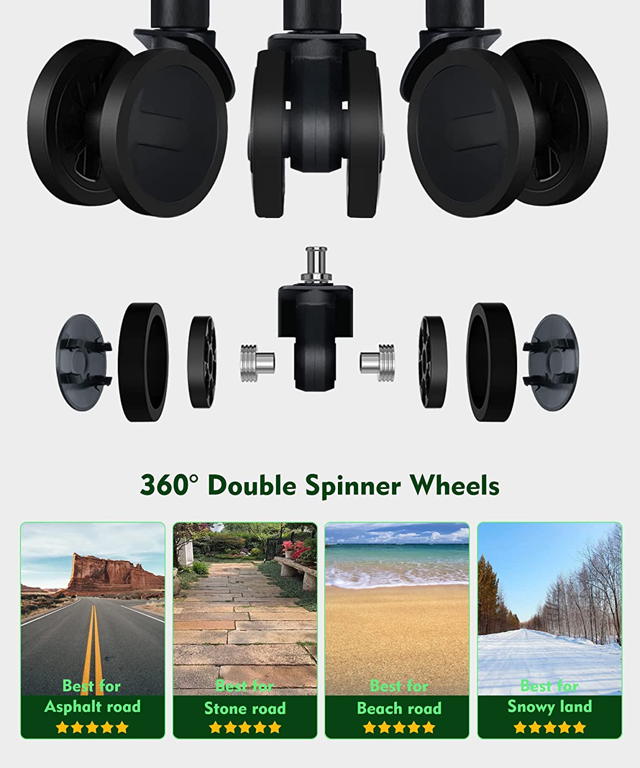 Rolling luggage with 4 double spinner wheels wheels means a smooth ride on any surface.