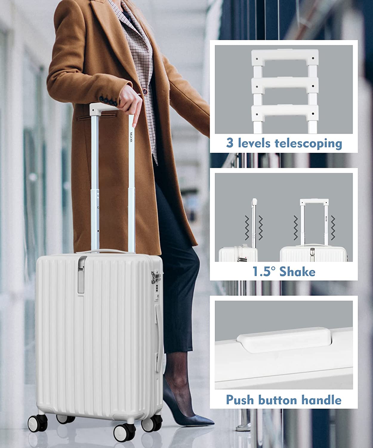 Sturdy and durable Push-button telescoping handle while adapting to different heights.