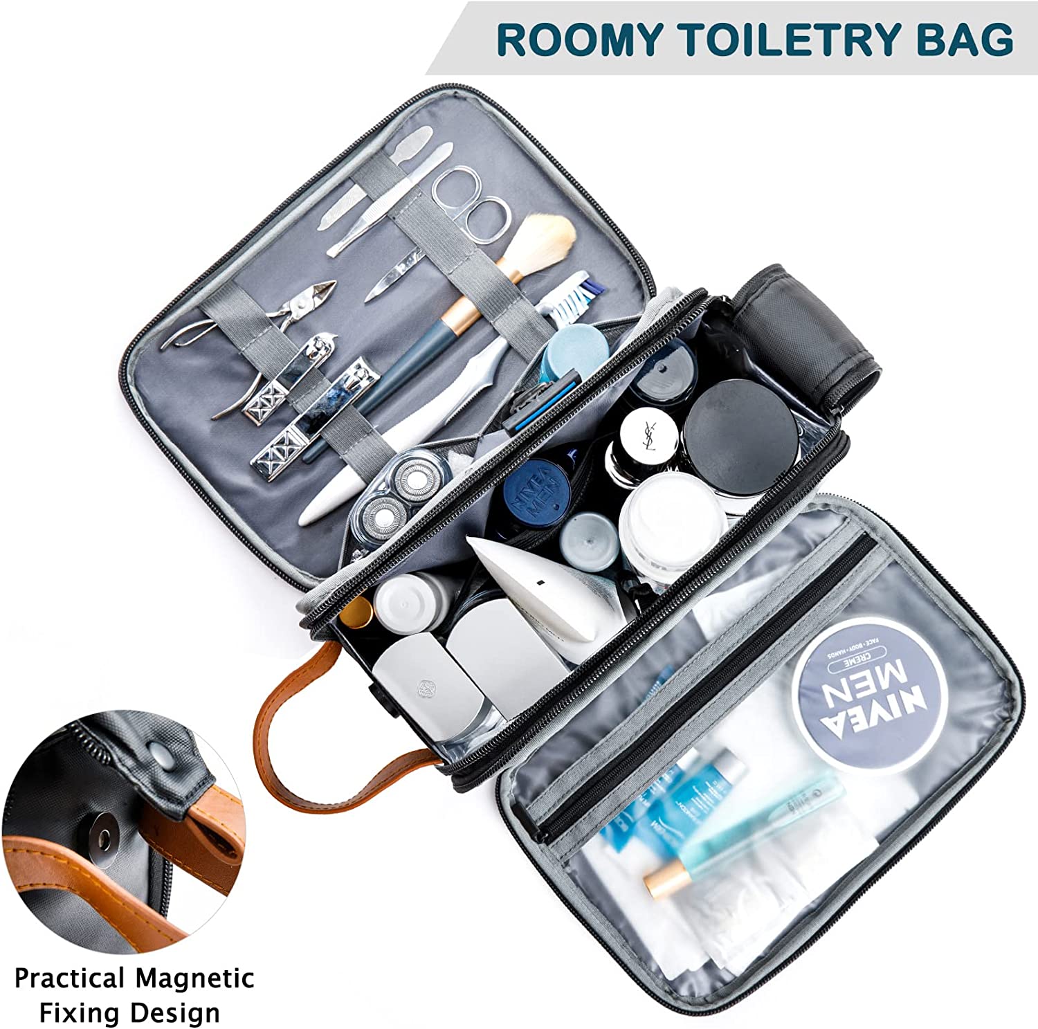 DOUBLE SIDE FULL OPEN DESIGN - Our travel bag 2 side compartments can be laid flat, no need to open the main compartment to search. Use the elastic band, mesh pockets and pouches to sort your tooth brushes, razors, electric trimmer, toothpaste, hair brush, or shaving razors easily accessible.
