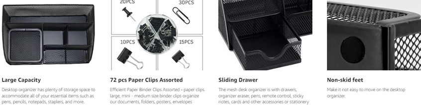 - [Durable and Versatile Design]This desktop organizer is not just for office supplies. Use it to store cosmetics, jewelry, mobile phones, business cards, and more. It's also a great choice for kids' desk organizers and storage. Made from lightweight mesh metal, this desk organizer is both sturdy and durable. The pen cup is designed to quickly store all kinds of pens and stationery.