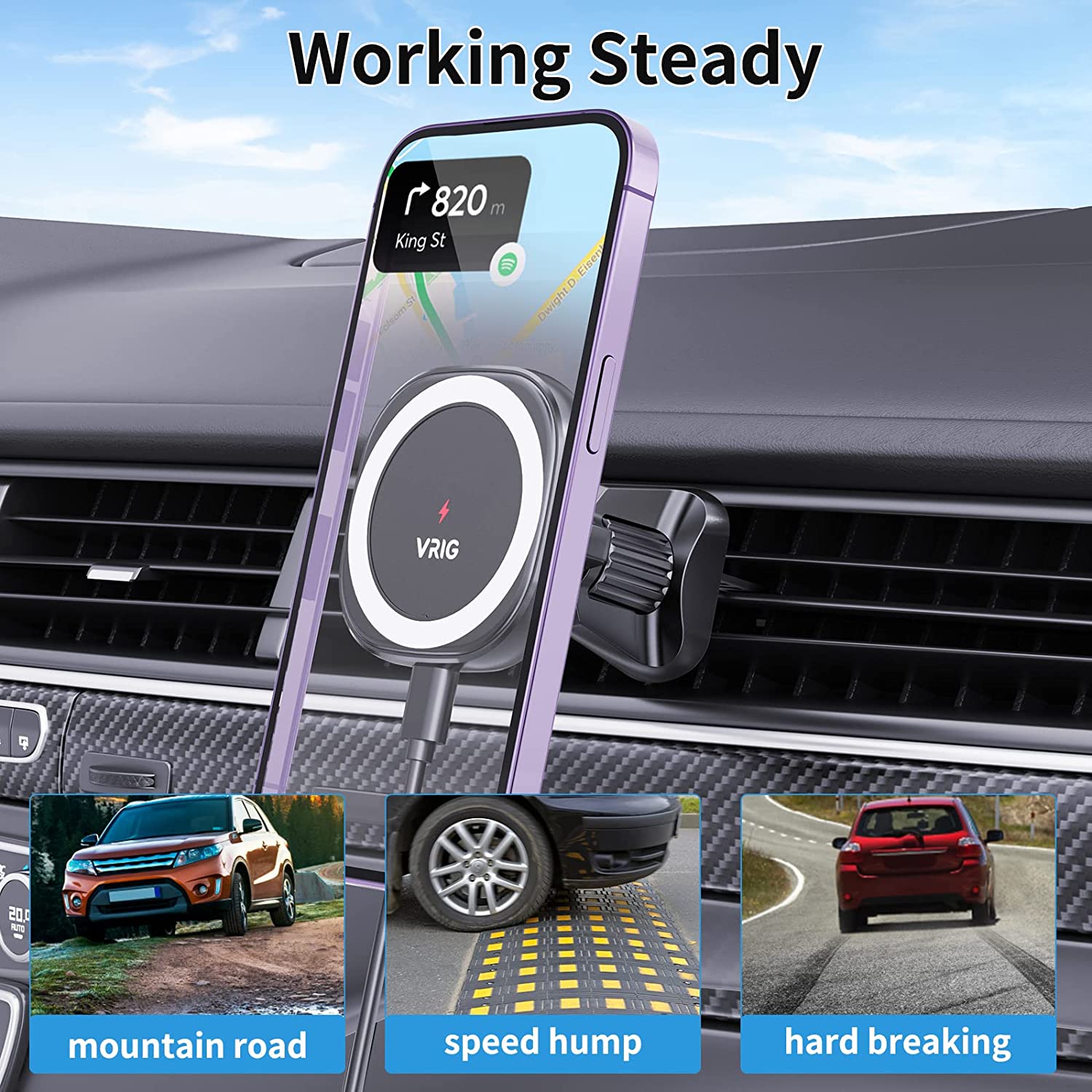 ? Convincing quality and universal compatibility: VRIG car phone stand has passed magnetic force, telephone signal, hook stability and ingredient safety tests. The quality shall be strictly controlled. The car stand holds most smartphones and mini tablets compatible with iPhone 14 13 12 11 pro max/XR/X/8/7/6/5, Note 9/Galaxy Note20 U, S21 S20 S10 S9 S8 S7 S6, iPad Air 2/mini 3/pro 9.7 and more. This product can be used with MagSafe.