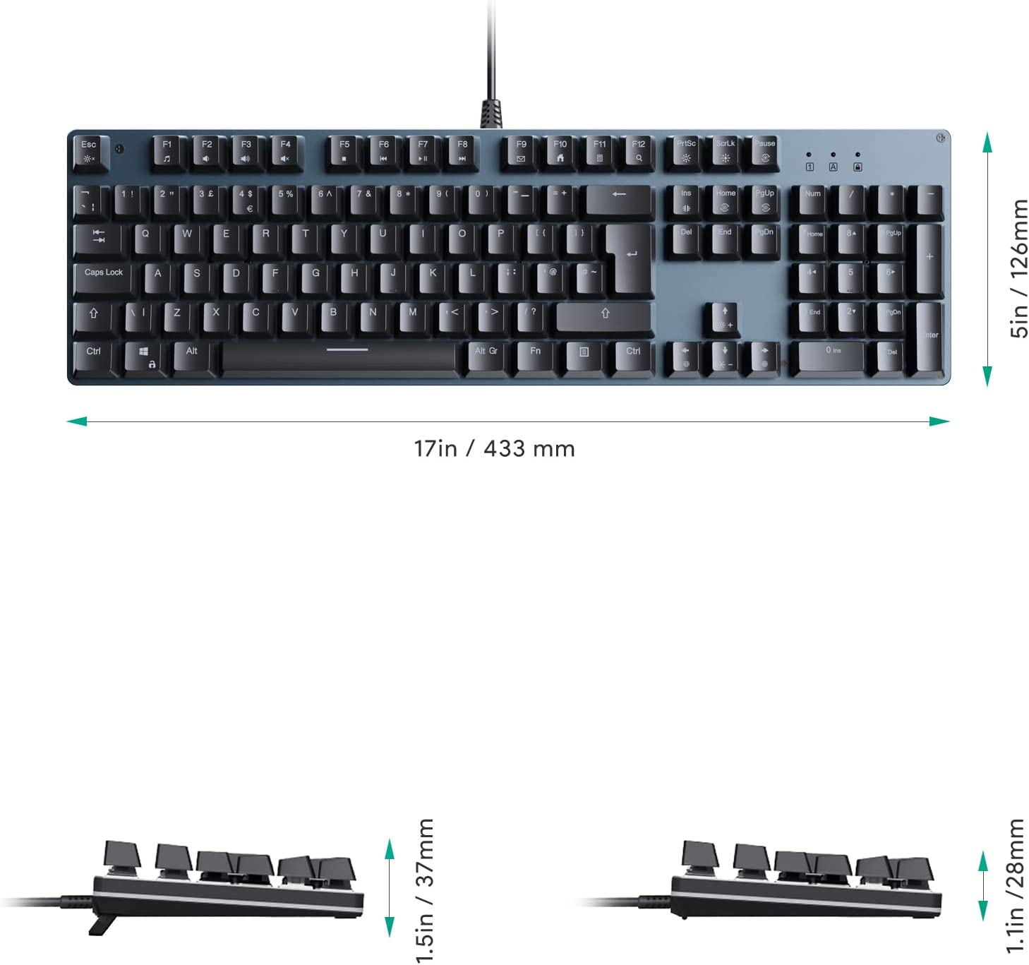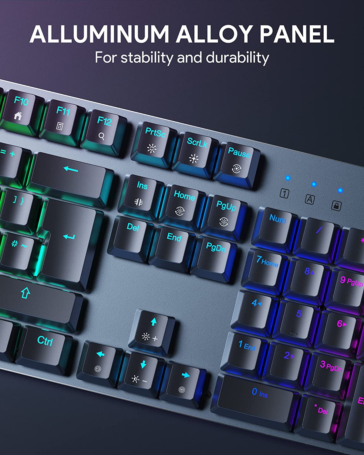 HIGH-QUALITY KEYBOARD: UV coated keycaps and injection laser carving ABS keycaps design, the letter of characters never fade. Metal and ABS construction make it more solid and reliable, the mechanical switches have a 50-million-keystroke lifespan