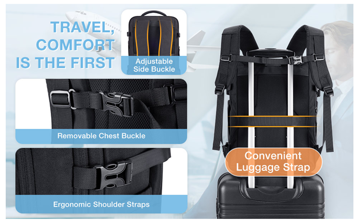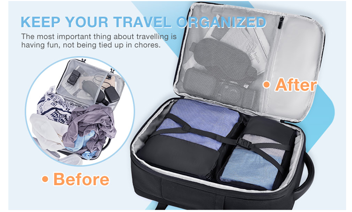 AIRLINE APPROVED: Travel backpack size: 20.47*13.38*7.87 inches. Maximum capacity: 40L, carry-on backpack meets the size required by almost all major airlines and fits in the overhead compartment and under the seat. Of course the lie-flat opening design helps you get through security quickly. This travel backpack is perfect for weekend trips, business trips, hiking, camping, etc.