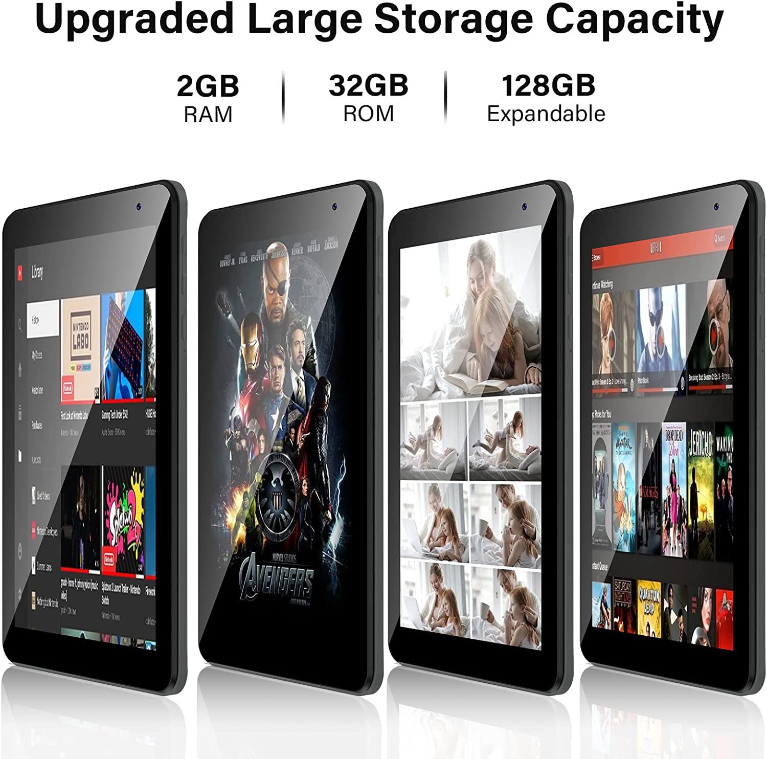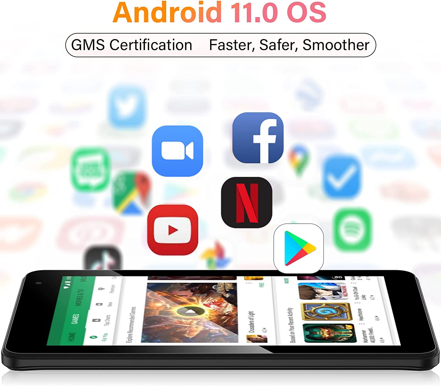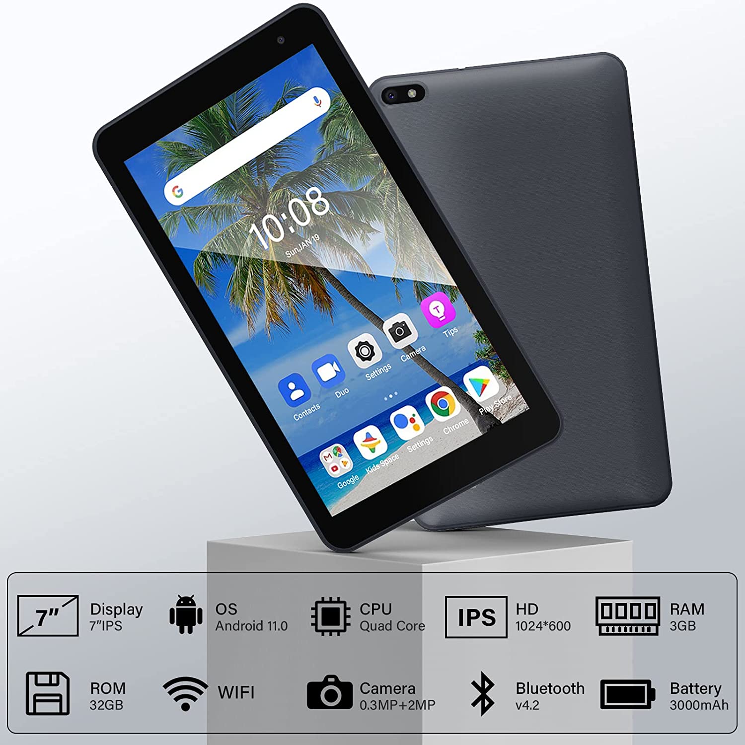 - 【Android 11, 128GB of Expandable】 7 inch tablet use the latest Android 11.0 OS, 2GB+32GB, Can be expanded up to 128GB via TF card, ensures you have an ultra-smooth gaming and speedy multimedia using experience, delivering quick app launches