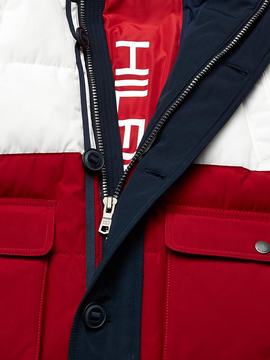 - Rib knit storm cuff details, rib knit detail on waist, and signature tommy embroidered flag at chest and tommy logo patch on arm