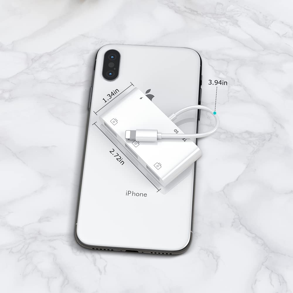 【6-in-1 USB Adapter for iPhone/iPad】♦ This 6 in 1 Camera Memory Reader is designed with Standard SD and TF card slot, 3 Camera Memory Reader and Charging Port. Help you transfer photos and videos from your high-resolution digital camera to your social software by inserting SD/TF card or connecting your camera USB cable directly with your iPhone/iPad.