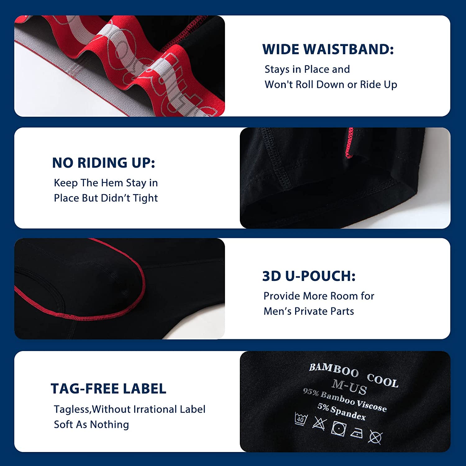 【PREMIUM FABRIC】: This men's underwear uses bamboo viscose fabric, which is skin-friendly, soft, cool and breathable. It fits your skin very well and doesn't cause allergies, static and other issues. In addition, the reactive printing and dyeing technology is used in the dyeing process of the fabric.Then this boxer briefs will not fade and will not harm the skin.