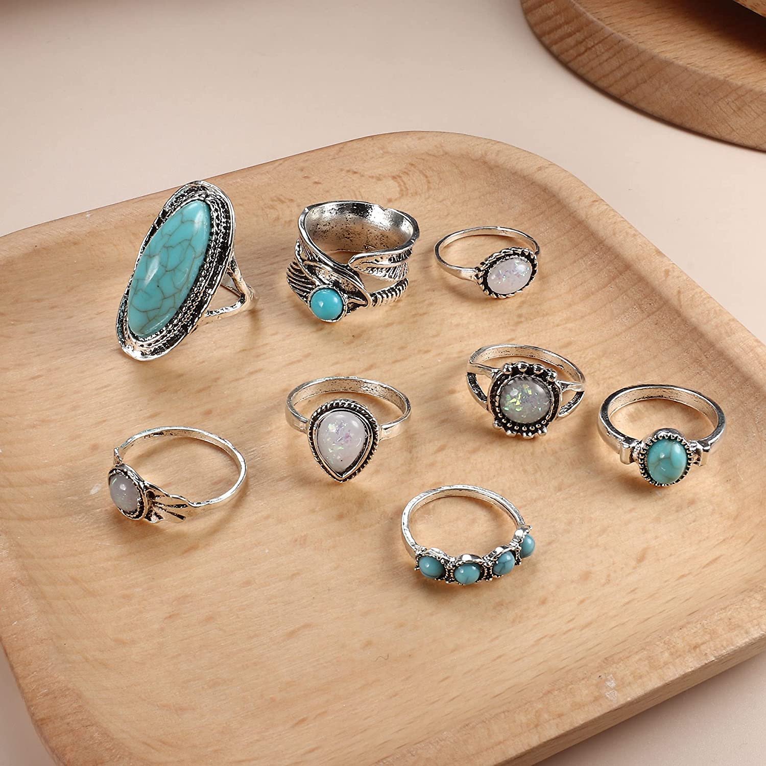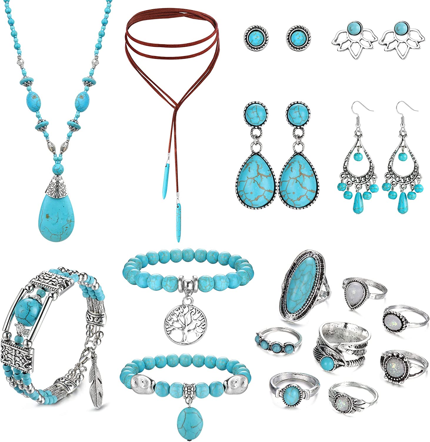 【TURQUOISE JEWELRY SET】Turquoise jewelry set includes 1 piece turquoise pendant necklace and 1 piece boho choker necklace, 1 piece layered turquoise bracelet and 2 piece adjustable turquoise bead bracelet,4 pairs of turquoise earrings and 8 pieces turquoise knuckle rings. Retro and fashion are perfectly combined to create a charming appearance for you.