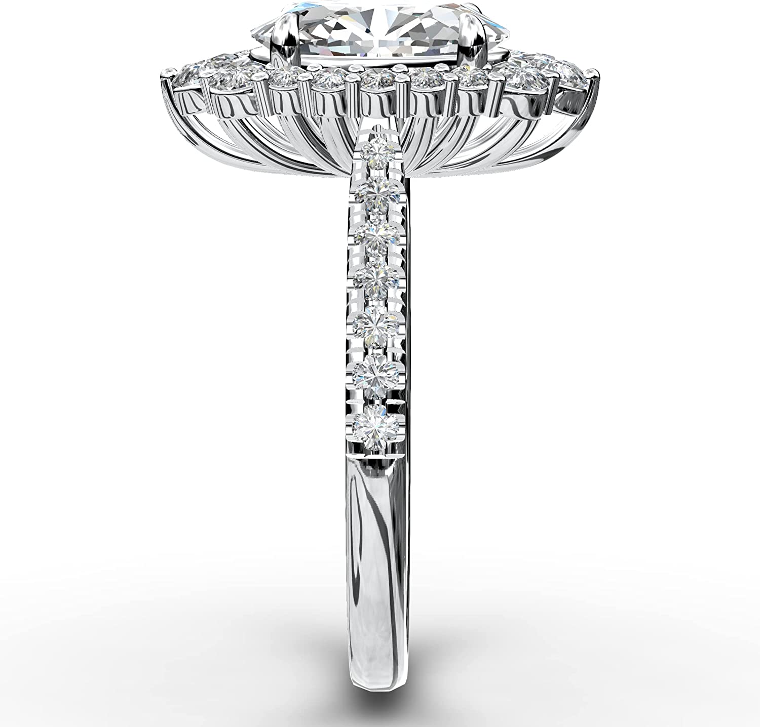 • Gem stones of engagement ring, 4-Prong Setting with DF Color VVS Clarity Moissanite, 1 x 3 carat (7*10mm) main stone, total 0.83 carat of 30 x small stones around the main stone and the ring body.