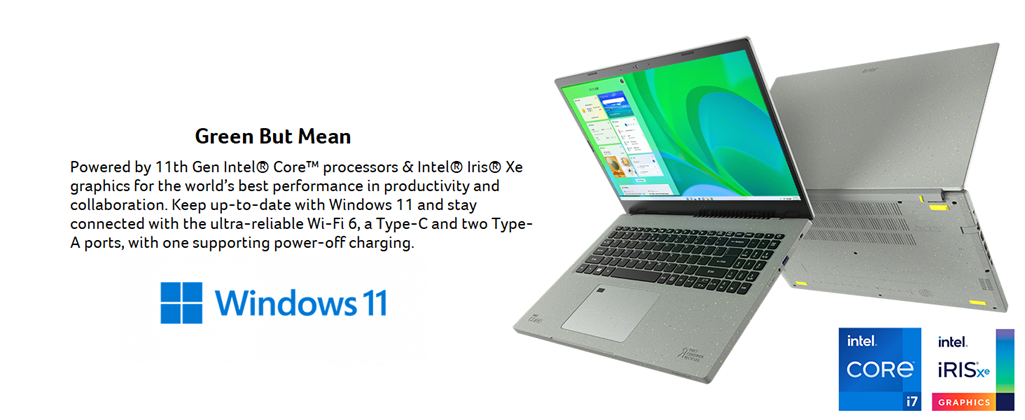 Acer Aspire Vero AV15-51-7617 comes with these high level specs: 11th Generation Intel Core i7-1195G7 Processor 2.9GHz with Turbo Boost Technology up to 5.0GHz (12MB Smart Cache), 15.6" Full HD (1920 x 1080) Widescreen LED-backlit IPS Display (100% sRGB and 300nit Brightness), Intel Iris Xe Graphics, 16GB DDR4 Memory, 512GB NVMe SSD, True Harmony Technology, Two Built-in Stereo Speakers, Acer Purified.Voice Technology with AI Noise Reduction & Two Built-in Microphones, 802.11ax Wi-Fi 6 Dual-Band 2.4GHz and 5GHz featuring 2x2 MU-MIMO technology, 10/100/1000 Gigabit Ethernet LAN (RJ-45 port), Bluetooth 5.0, Acer Bio-Protection Fingerprint Solution, featuring Computer Protection and Windows Hello Certification, Back-lit Keyboard, HD Webcam (1280 x 720), 1 - USB 3.2 (Type-C) Gen 1 port (up to 5 Gbps), 2 - USB 3.2 Gen 1 Ports (one with Power-off Charging), 1 - USB 2.0 Port, 1 - HDMI 2.0Port with HDCP support, Lithium-Ion Battery, Up to 7.0-hours Battery Life, Amazon Alexa, Acer Vero Protective Sleeve, Windows 11 Home, EPEAT Silver Certified, 3.97 lbs. | 1.8 kg (system unit only) (NX.AYCAA.006).
