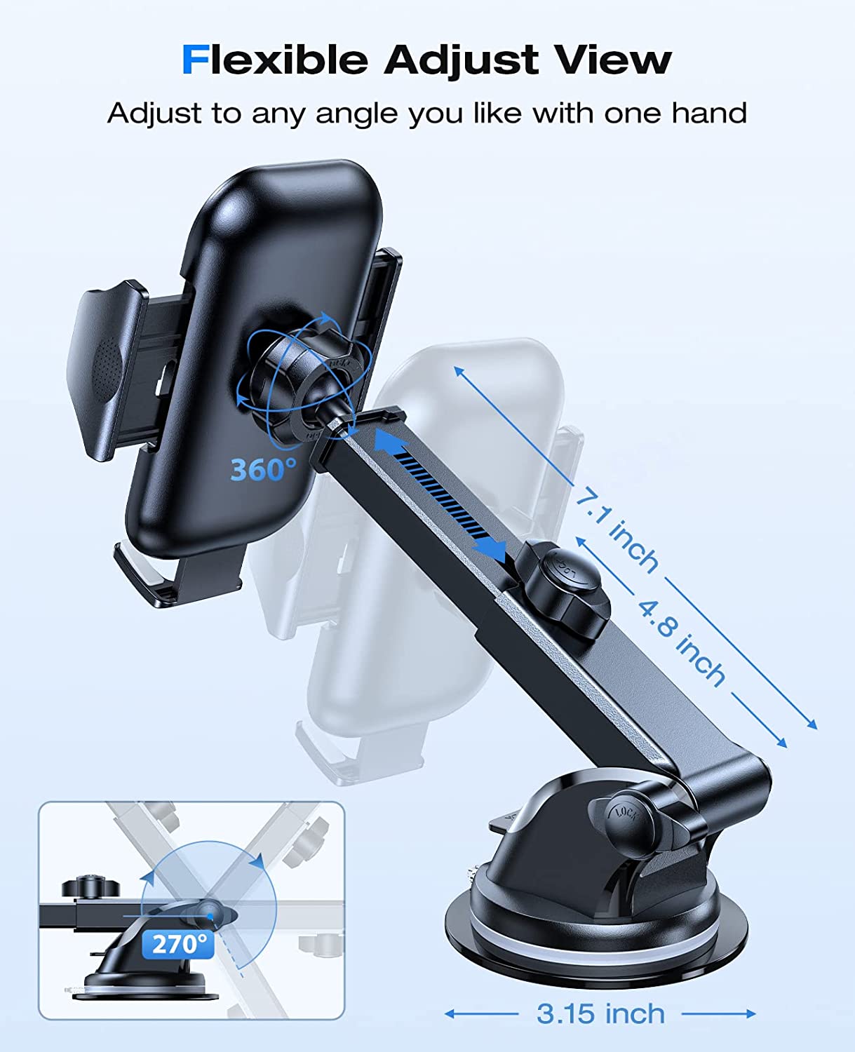 [Adjust Any Angle As You Wish] The Vicseed car cell phone holder has flexible and adjustable long arms that can be adjusted from 4.8 to 7.1 ft. 360-degree omnidirectional adjustment ball joint allows for flexible rotation and can be used portrait or landscape for navigation, video calls. Installation can be done with just one hand: Push side release button - Place the phone - Gentle squeeze clamp arms to close. The best viewing angle adjustment for the safest driving