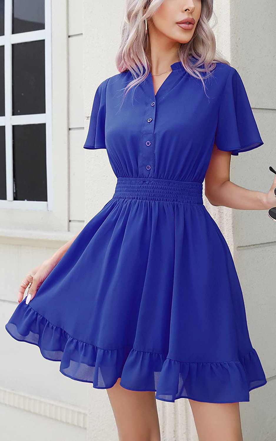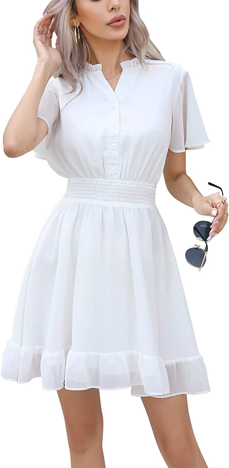 EXLURA Womens Summer Button Down V Neck Dress Short Sleeve Mini Party Dress Ruffle A-Line Cocktail Dresses