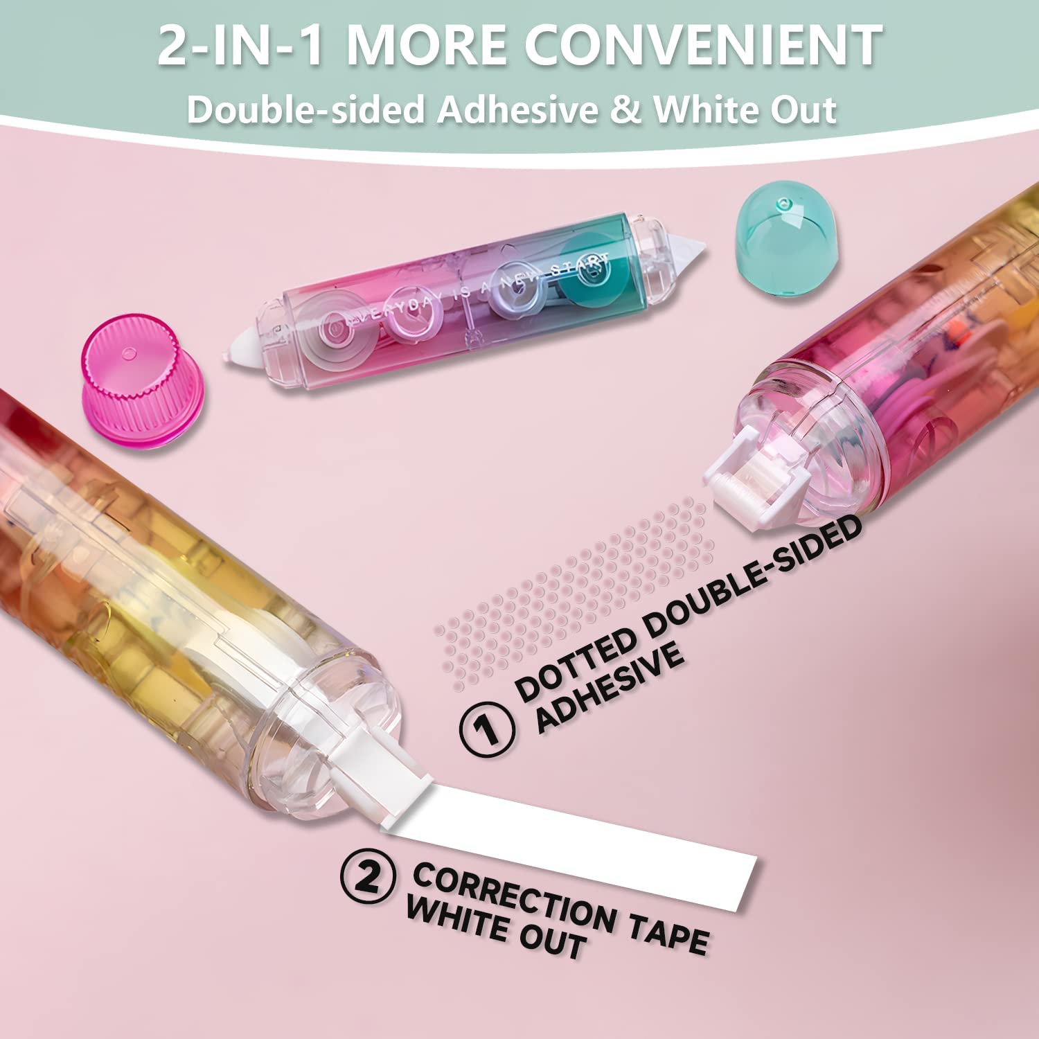• CUTE AND EASY-TO-USE. Designed in the shape of a Double-ended pen ,Bring this double-sided tape roller applicator with white out correction tape in one pen,anytime and anywhere. It has a protective tip cover that's avoiding your bag from sticking to the adhesive. It's ideal for school use, gift-wrapping, scrapbooking, and other office home projects.