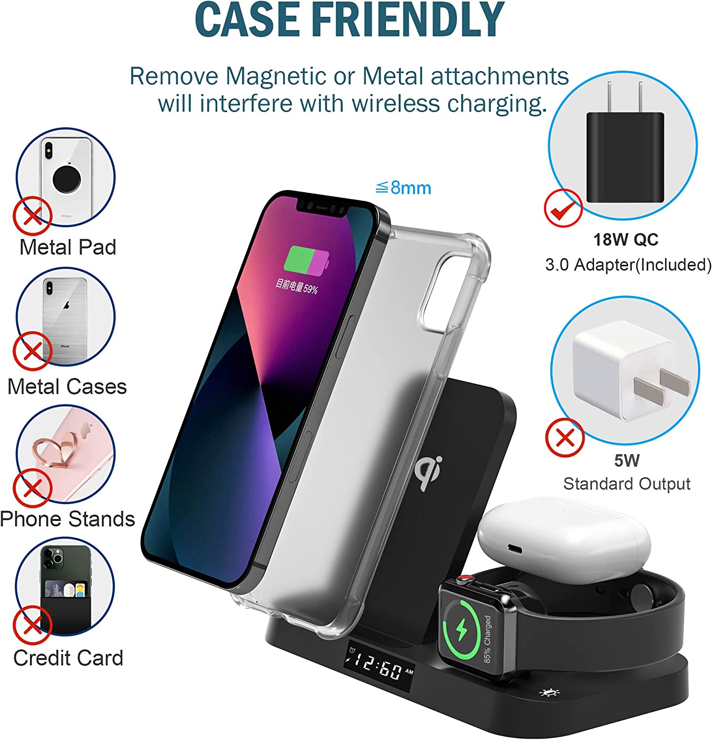- Phone Case Friendly: The dual angle-adjustable feature must surprised you. The phone support part can be adjusted and fixed at any angle range from 0 to 135°. Therefore, the iPhone and Apple watch charging station is suitable for any iPhone model with different thickness case ≤8mm(even with popsocket). Whether the phone case is removed during charging is no longer a question for you.