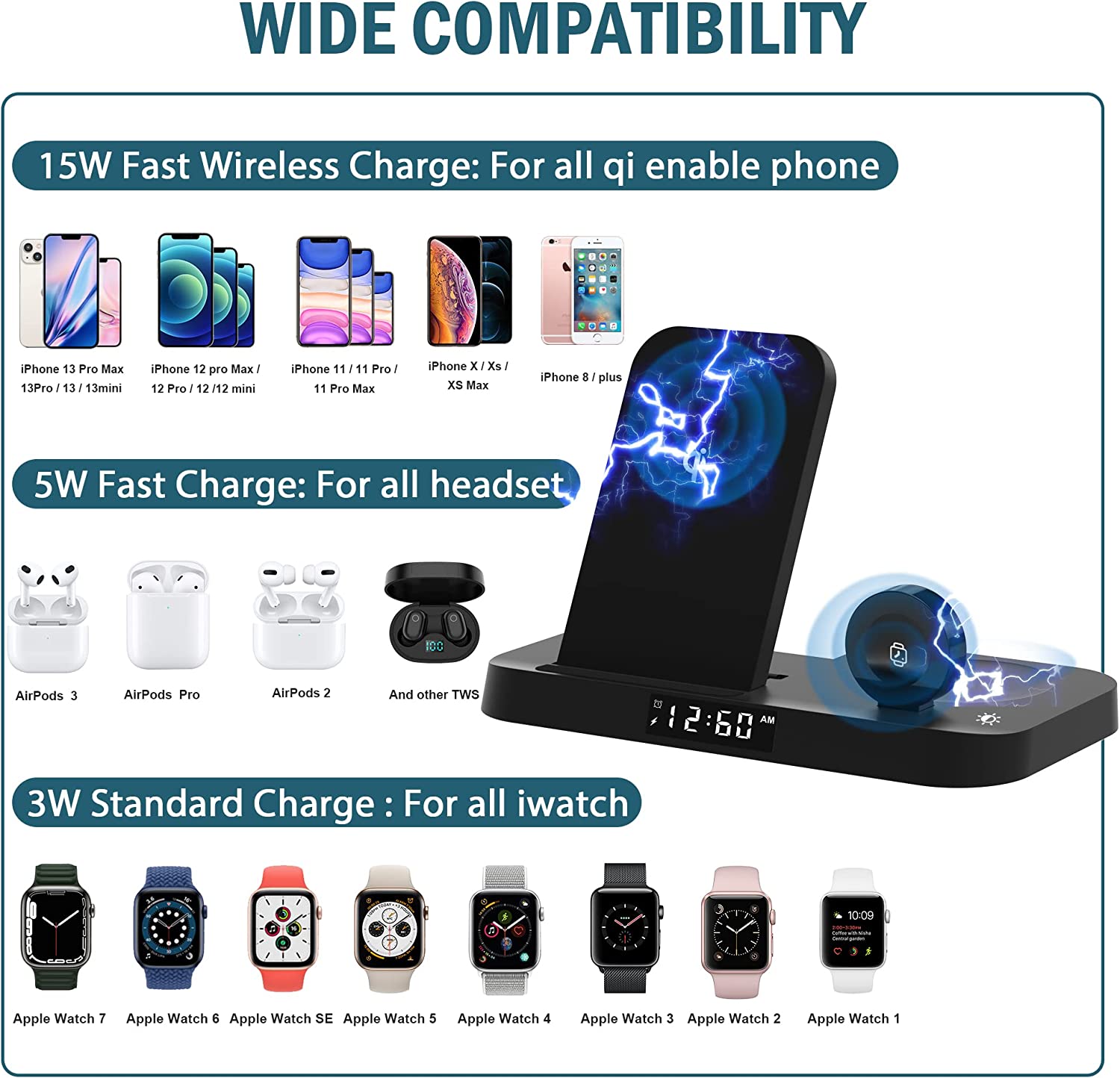 - 3-in-1 fast wireless charger: an integrated charging station for multiple devices. The charging station is compatible with Apple Watch+AirPods+iPhone. The 3-in-1 charging station can be one Apple watch charging station, one mobile phone charging station and one AirPods charging station, and is compatible with 99% of mobile phones that support wireless charging.