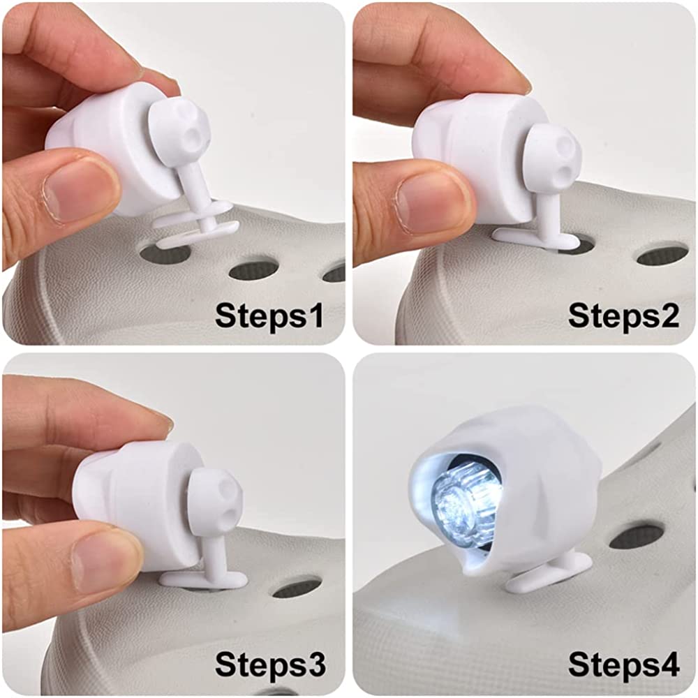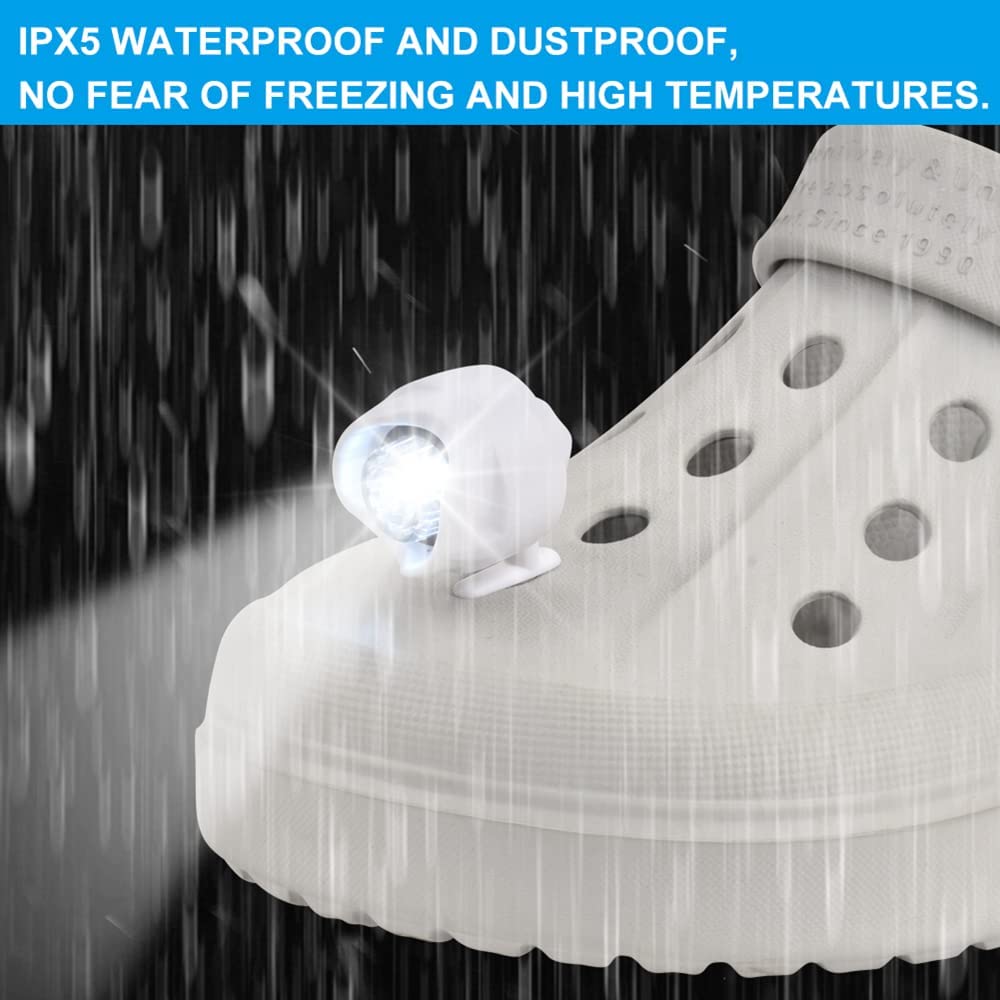 【Premium Qualitys】Made of ABS plastic, these croc lights for clogs are so well made that each light weighs only 0.04 pound, U-shaped base design, Fit the shoes tightly, you can't feel them when Outdoor activities, suitable for children over 4 years old and adult shoes   【Reusable 10000 Hours】Our rechargeable battery use environmentally friendly materials and are recyclable. It can be reusable for more than 10,000 hours, which is equivalent to buying 280 CR2032 batteries for shoe lights  【IPX5 Waterproof and Durable ABS Plastic】Silicone ring sealing interface, efficiently deal with rainstorm weather and the dew on the Grass when camping. Sturdy ABS Plastic Material anti-fall, anti-extrusion, high-temperature resistance  【Upgraded hidden Switch】More fashionable, press on the head of the light to turn on/off and switch three different modes (Always Bright, Flashing, or Flashing slowly)  【Bright and Long-Lasting】 Much brighter than a phone flashlight, Light up 33 feet away, Can be used for 72 hours after fully charged