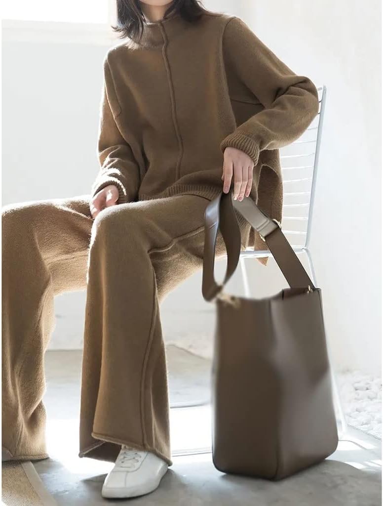 Walnut Age-reducing Thin Knitted Suit Women's Slit Sweater Wide-Leg Pants Autumn and Winter Two-Piece Set (Color : D, Size : L Code)