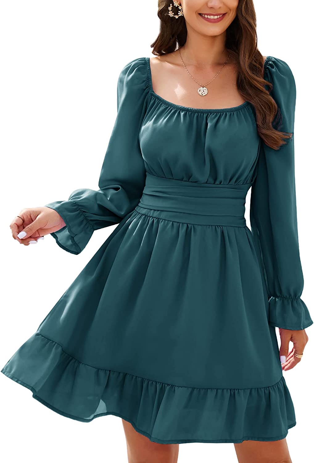 AISWI Women's Tie Back Flowy Dress Long Lantern Sleeve Square Neck Ruffle Elastic Waist Aline Casual Mini Dress