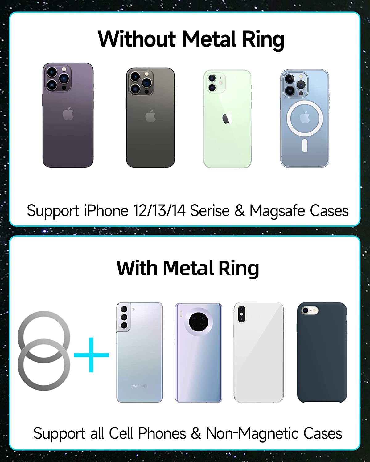 ?【Upgrade Car Phone Mount】 Tesla phone mount With 24 built-in strong magnets, help this cell phone holder holds your phone firmly and stably even on bumpy roads. The base has 2PCS 3M adhesive pads to allow this phone holder to mount on the dashboard or back of the central control screen firmly without worrying about falling out. (NOTE: If your iPhone 12/13/14 has a thick case or you use other iPhone or Android phones, please stick the metal ring on the back of your phone or case.)