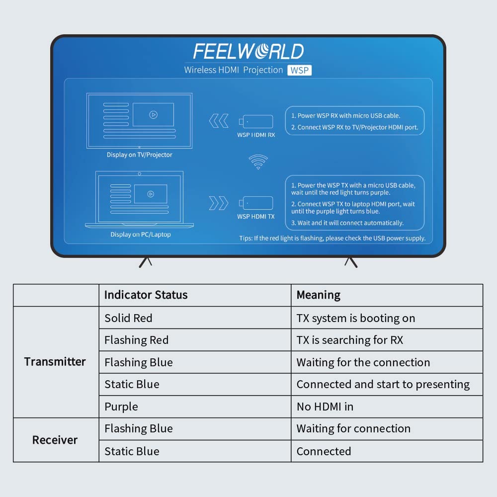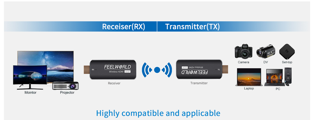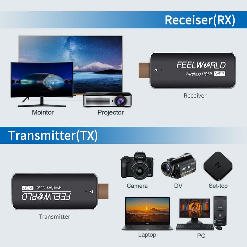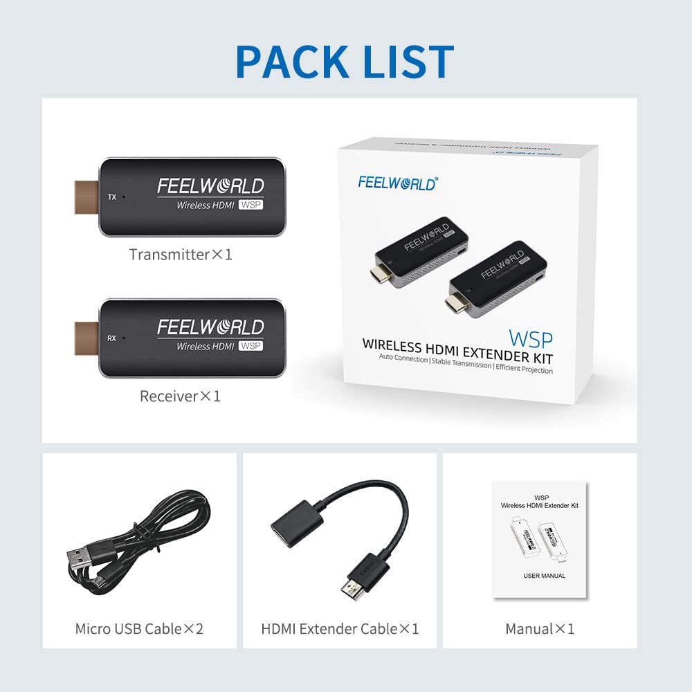 - High compatibility, end-to-end signal transmission: FEELWORLD mini wireless HDMI extender kit work with most HDMI equipped devices such as TV box, camera, DVD,Laptop,Devices without HDMI interface can also use the transmitter via