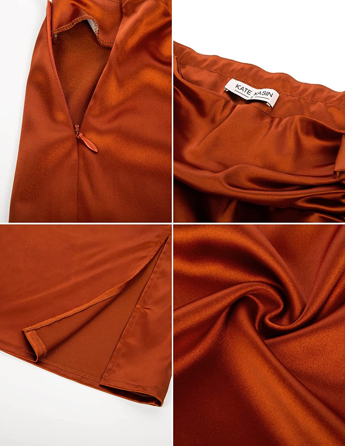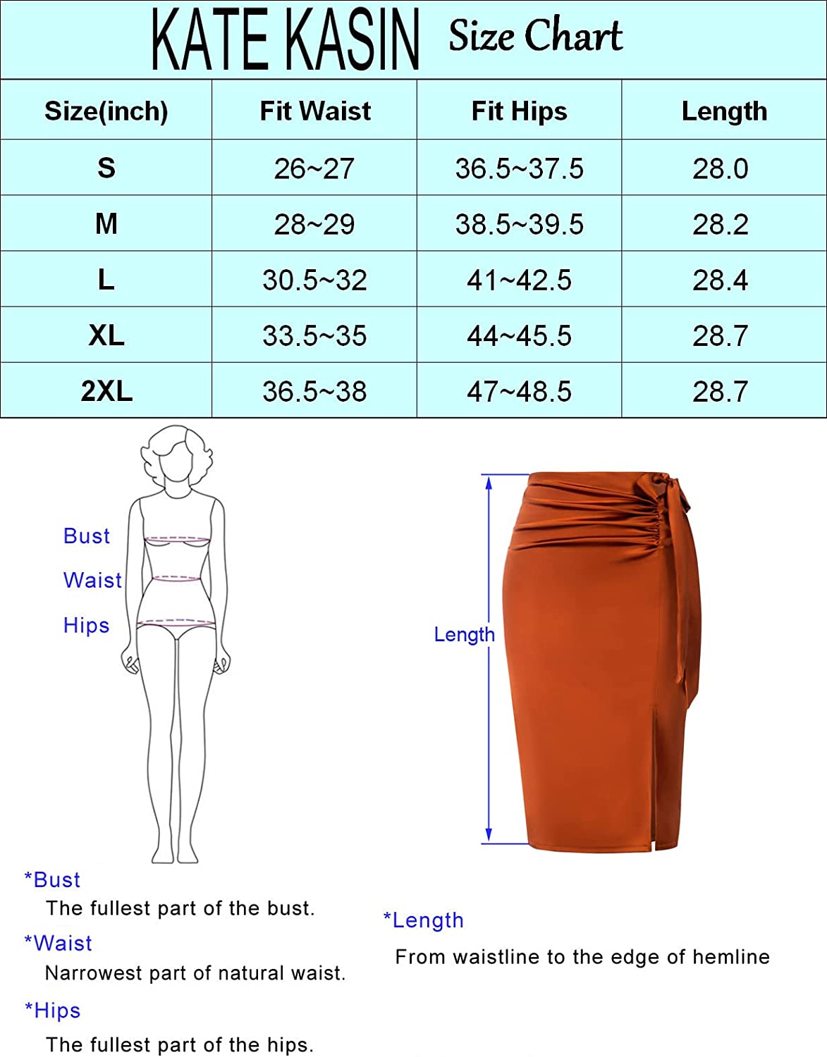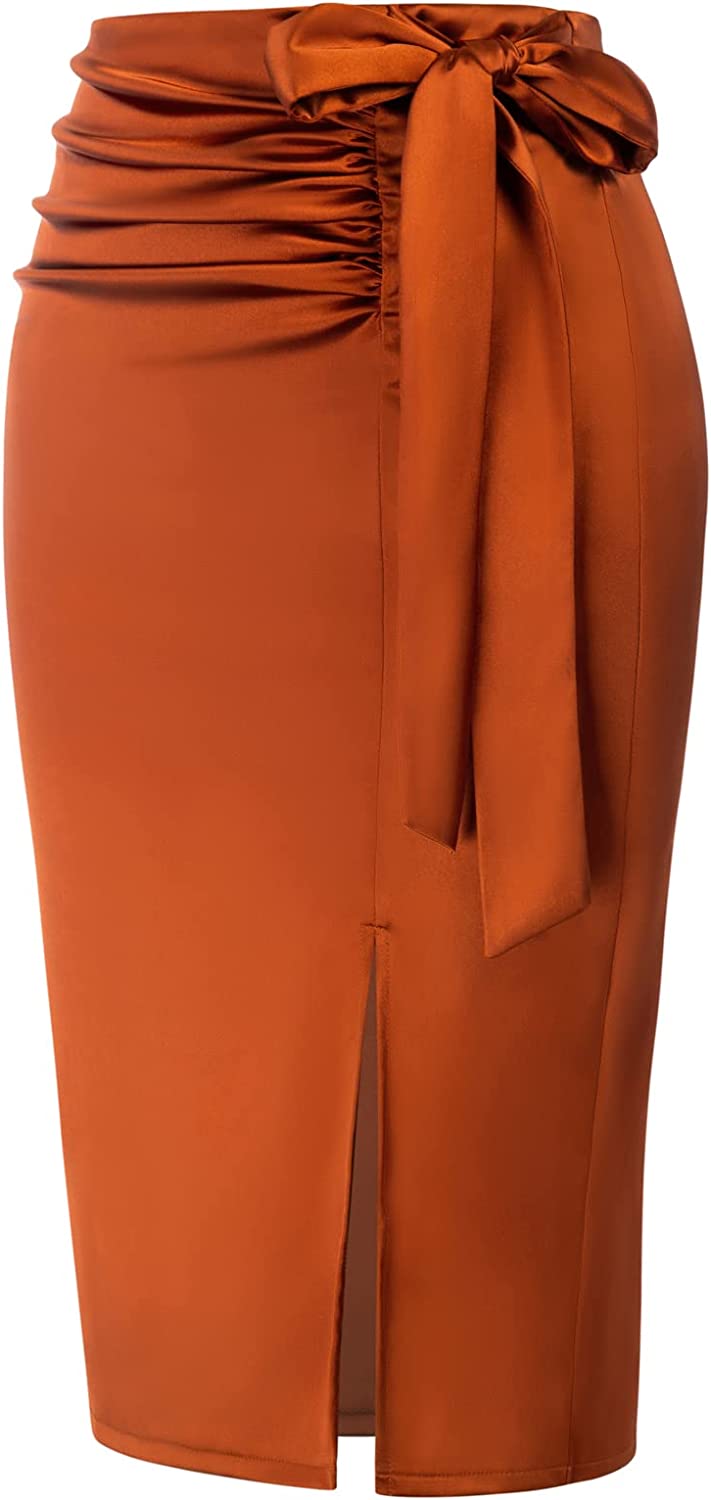 Kate Kasin Women's Satin Silk Bodycon Split Skirt High Waist Bow Tie Knee Length Pencil Midi Skirts Wear to Work