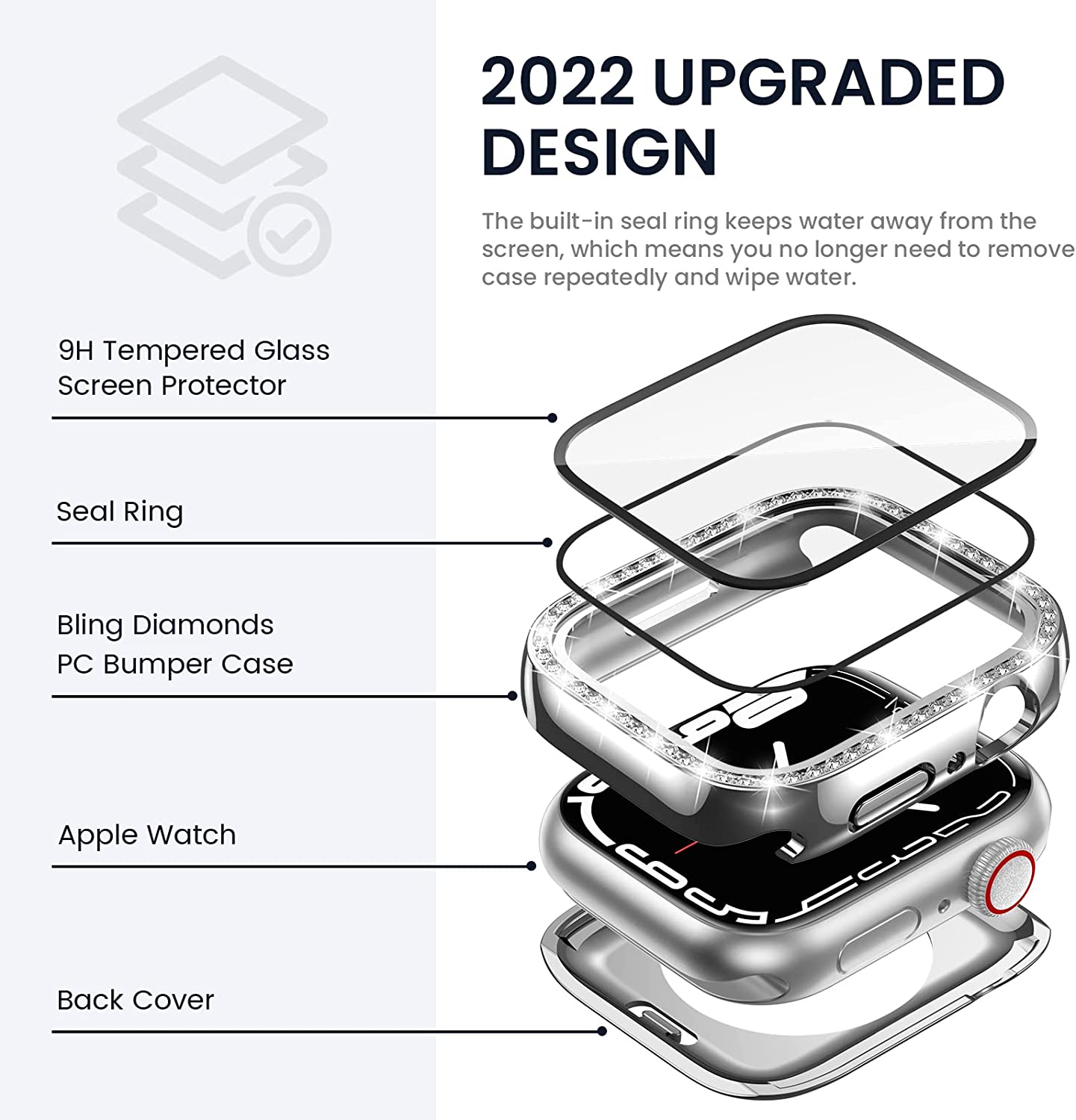 [COMPATIBILITY] Designed for Apple Watch Series 8 41mm & Apple Watch 7 41mm, please choose the suitable model by you need. Bling diamonds cover with screen protector, protect and stylish your Apple Watch! NOTE: Not fit for Apple Watch 8 45mm & Apple Watch 7 45mm (Choose the other size variation), Apple Watch SE 2022 Series 6/ 5/ 4 40mm or 44mm, Series 3/2/1 38mm or 42mm.