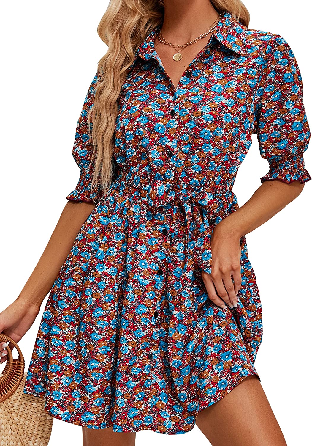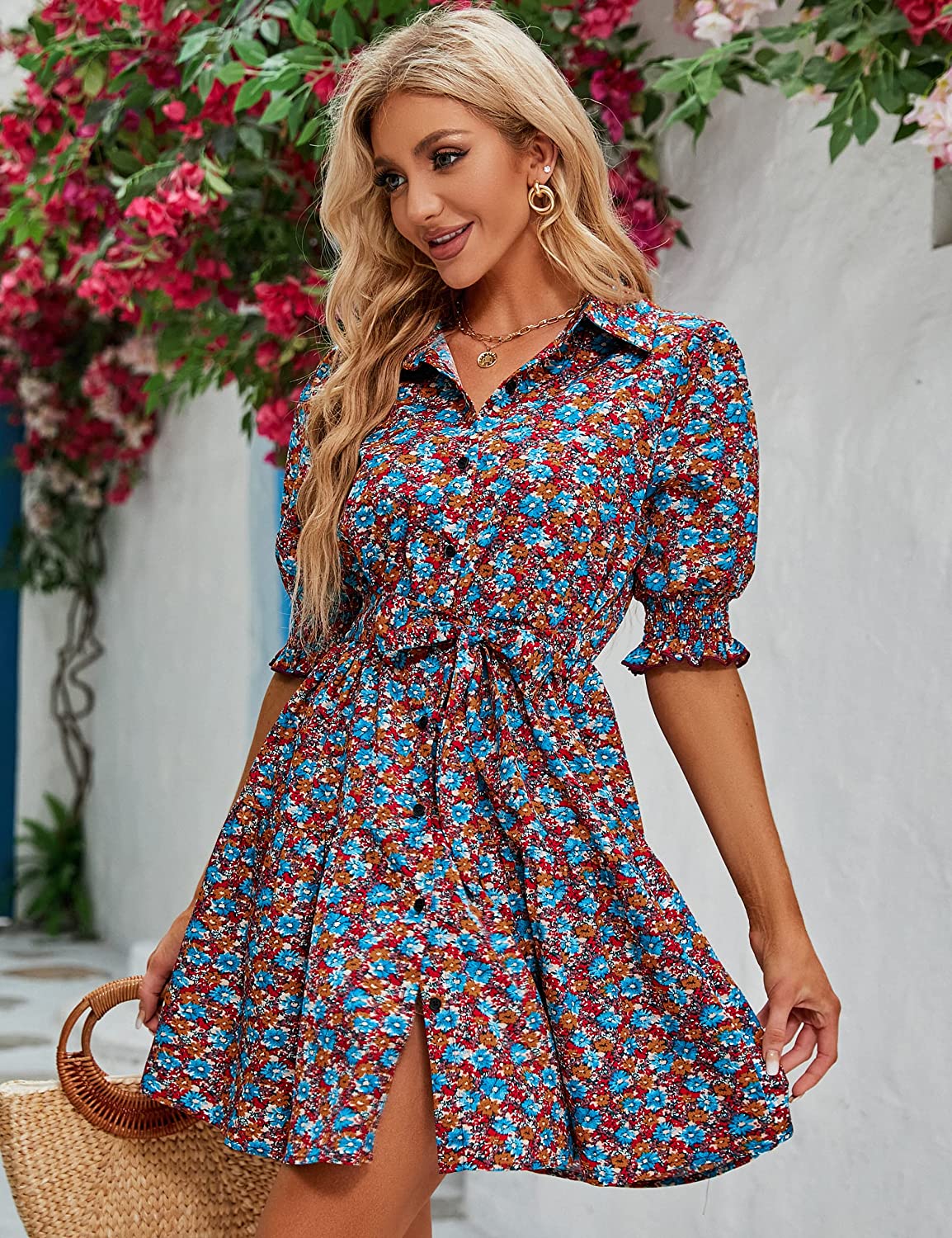 Feature: Womens summer dresses feature square neck, puff short sleeve with elastic cuffs which also can be sexy off shoulder, stretchy smocked bust design, elastic empire waist with cute ruffle, tie open back, 2 pockets, floral print, above knee length, a line baby doll silhouette, releaxed fit.