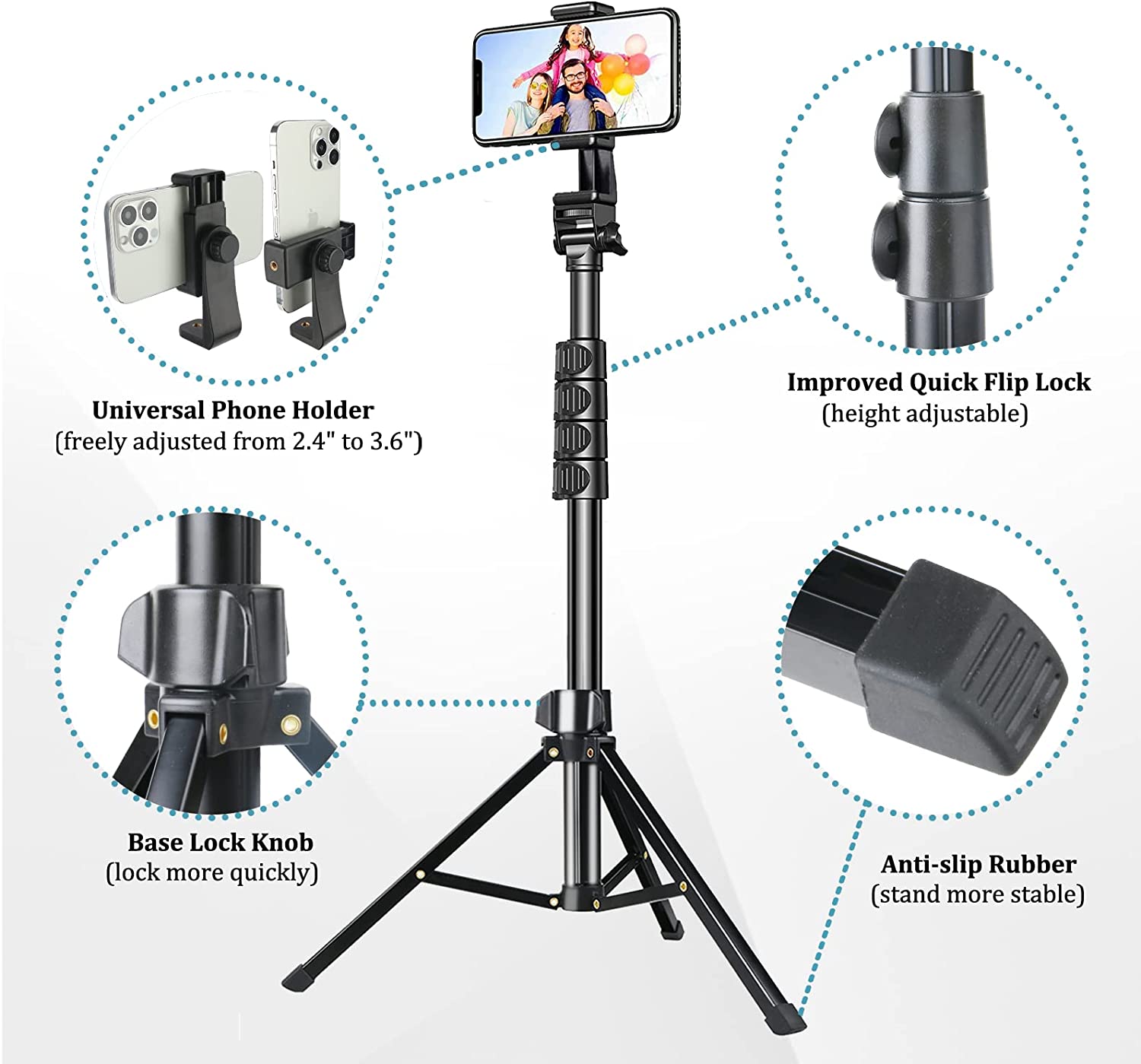 • 【WIDE COMPATIBILITY 】 Tripods for cell phones come with a universal phone holder, which can be freely adjusted from 2.4" to 3.6", suitable for phones and android. Coupled with the top of the stand, universal 1 /4" screws can be connected to most digital cameras, sports cameras, and GoPro.