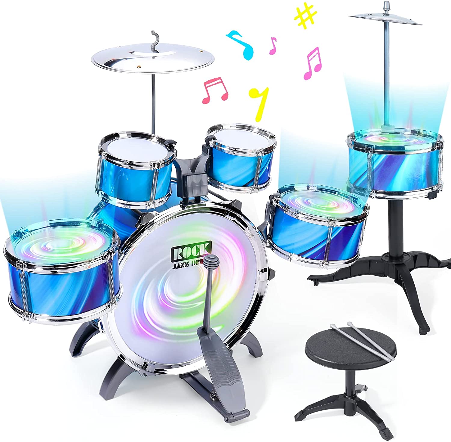 Kids Jazz Drum Set for Toddlers 1-3 (15-Piece), Drum Kit Musical Instrument for Beginner Music Practice w/ 4 Lights, 6 Drums, 2 Cymbals, 2 Drumsticks, Stool (Blue)