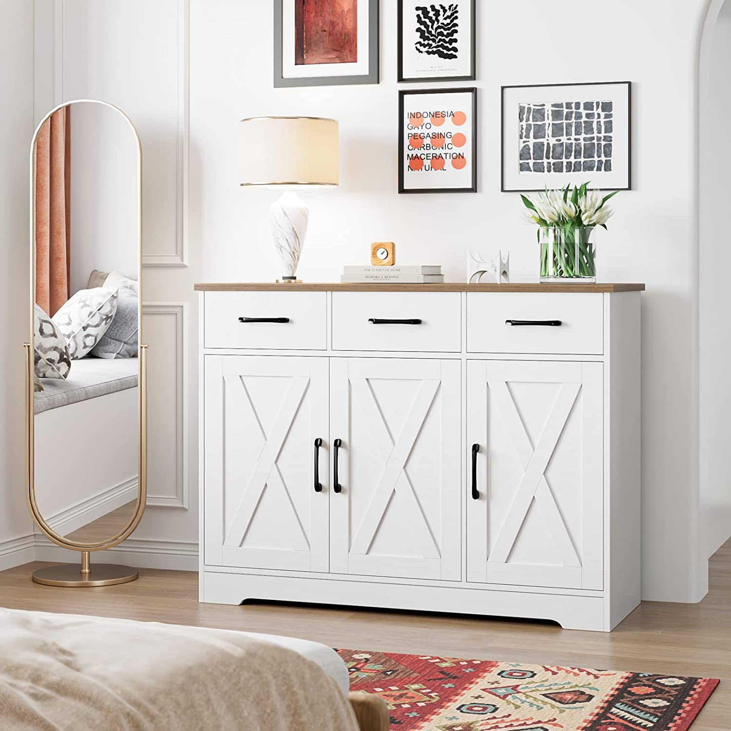 - 【FARMHOUSE & MODERN】Marring an impressive wood grain surface with white finish, the sideboard buffet with storage perfectly fuses farmhouse flair and classic modern style, which makes it easy to blend with any cottage, contemporary, modern farmhouse and more traditional interiors