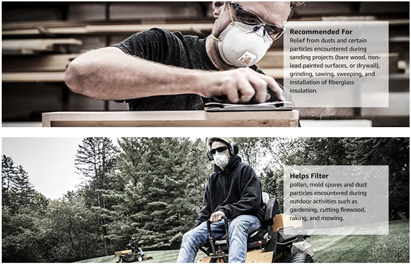 • RECOMMENDED FOR relief from dusts and certain particles encountered during sanding projects (bare wood, non-lead painted surfaces, or drywall), grinding, sawing, sweeping, installation of fiberglass insulation