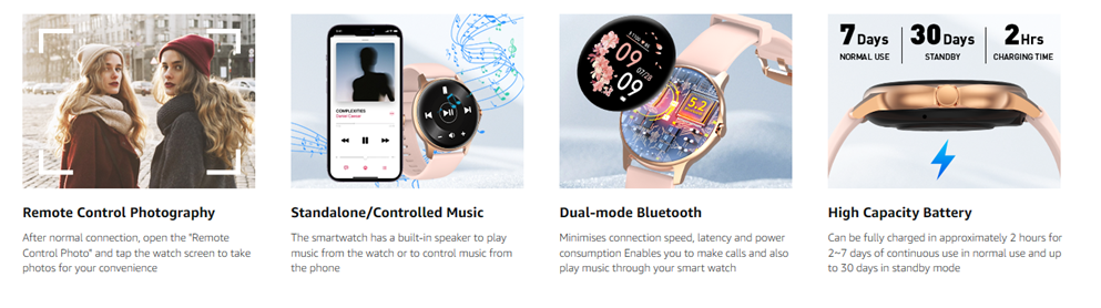 - 【Colorful Visuals & Customised Watch】The Best Combination of Style and Functionality. High-quality metal frame with 1.28-inch HD color display and 2.5D curved glass provides you with a more vivid and wider view. With the app connected, there are 150+ different beautiful dials to choose from. Also you can go for something totally unique with your own favorite pictures, such as your family, pets, idols. Whenever you raise your hand, the smart watch screen lights up to show off your personal style.
