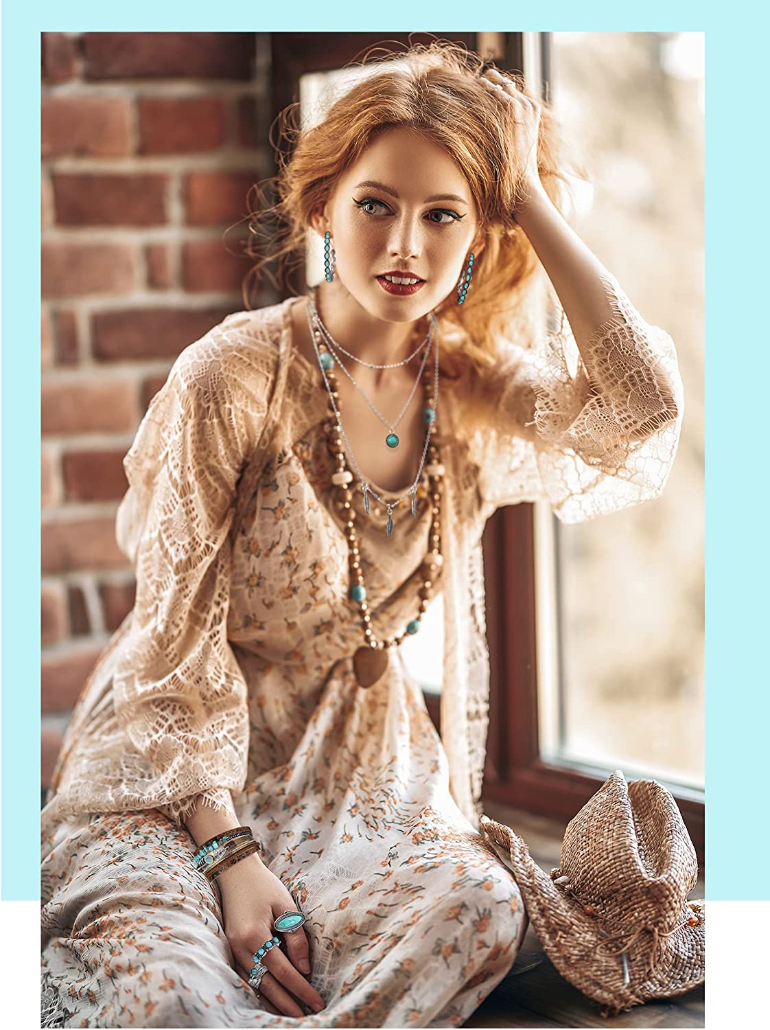 Package Includes: the package will come with 6 pieces of turquoise jewelry for women, including a piece of turquoise faux leather layered bracelet, a pair of turquoise dangle earrings, a piece of turquoise pendant necklace and 3 pieces of turquoise finger rings, good collocation to meet your wearing, matching and replacement needs