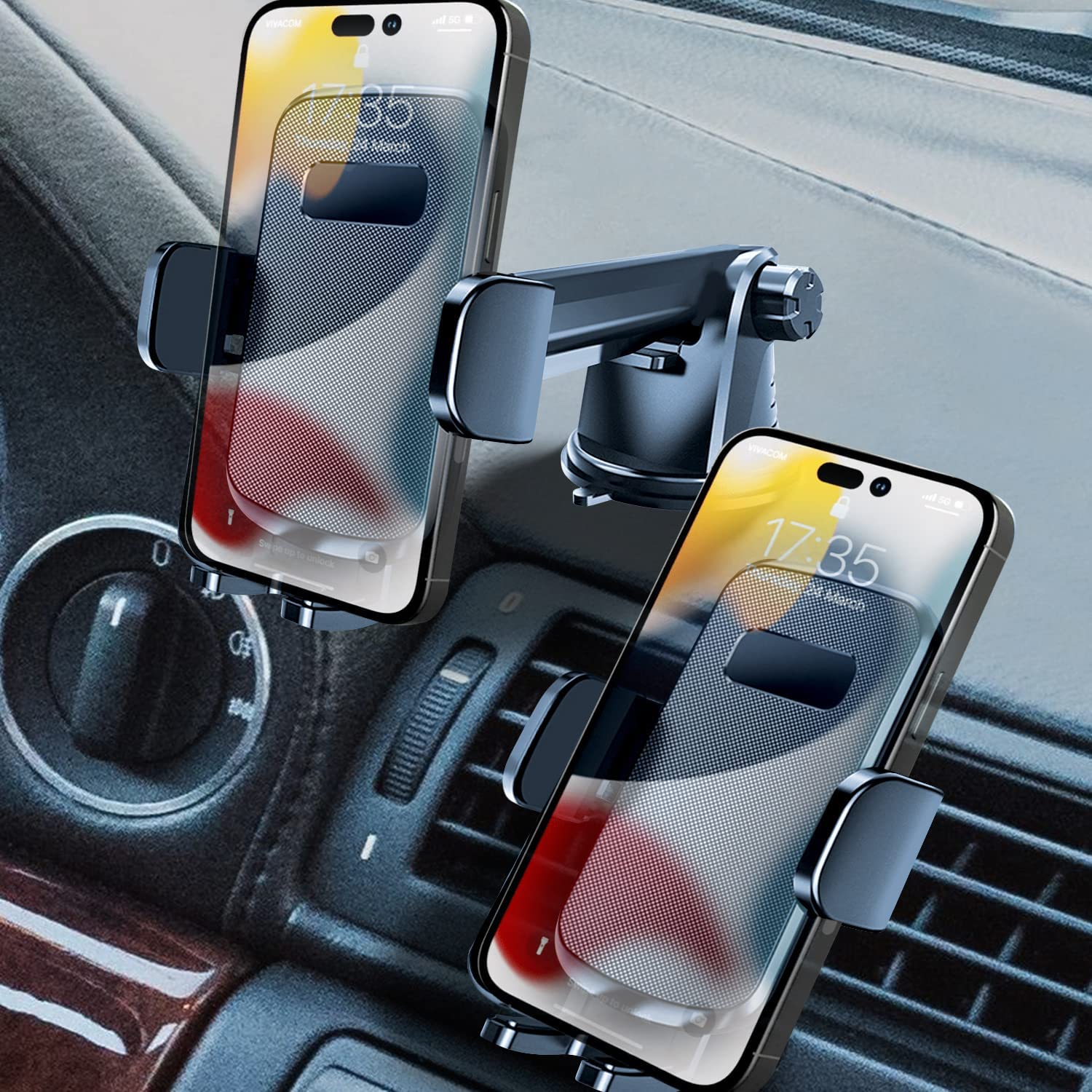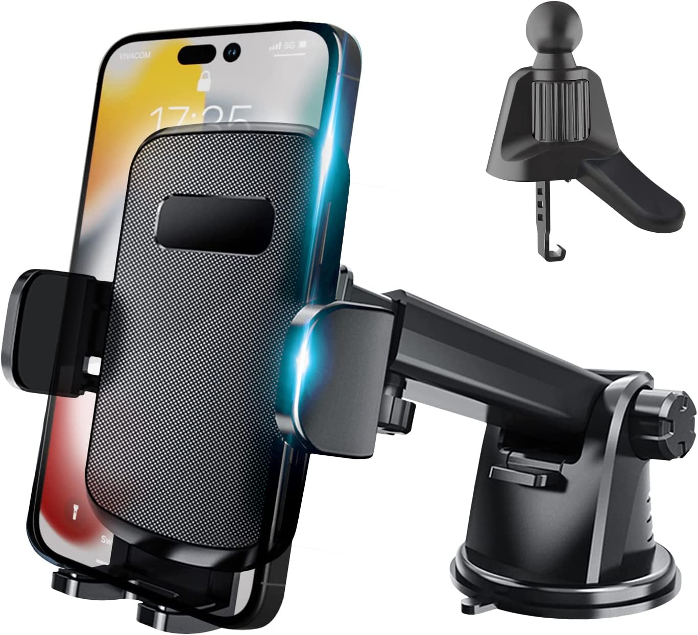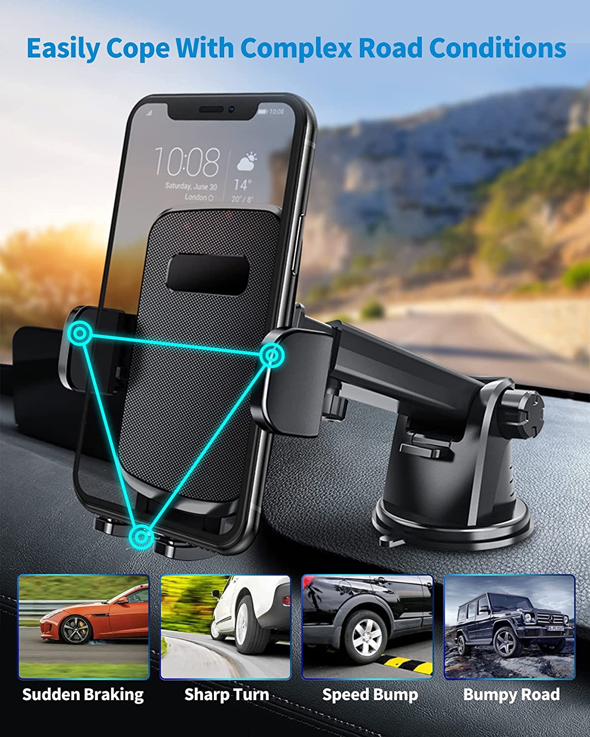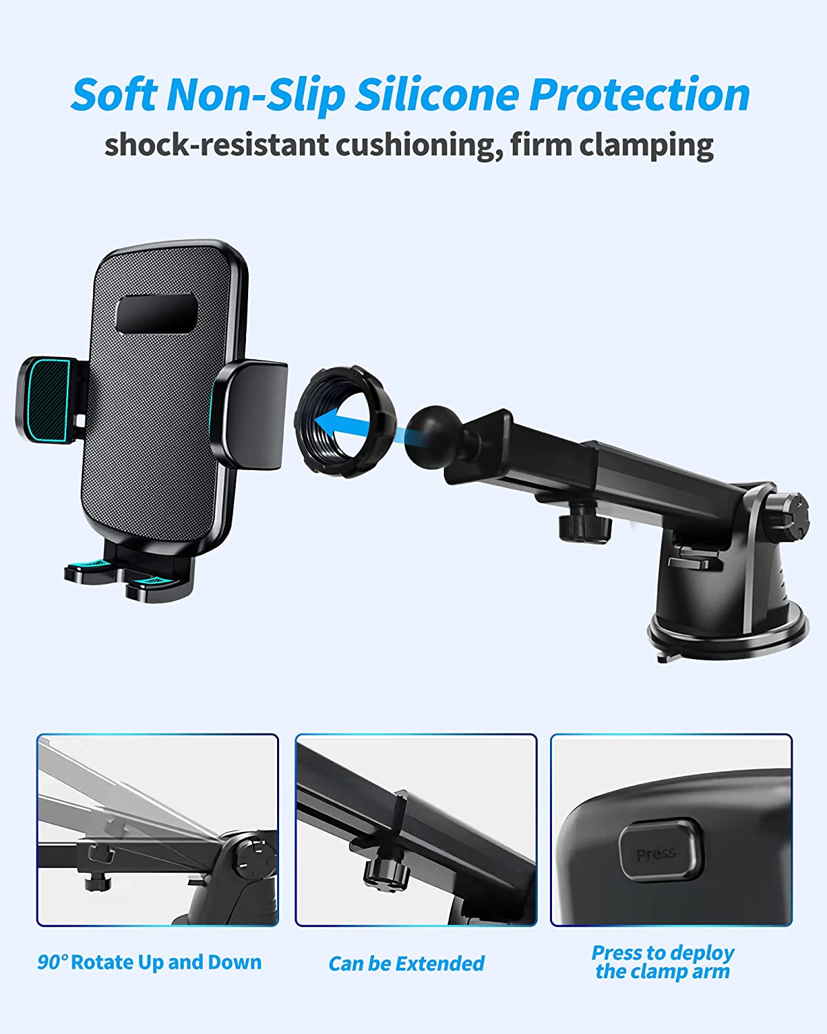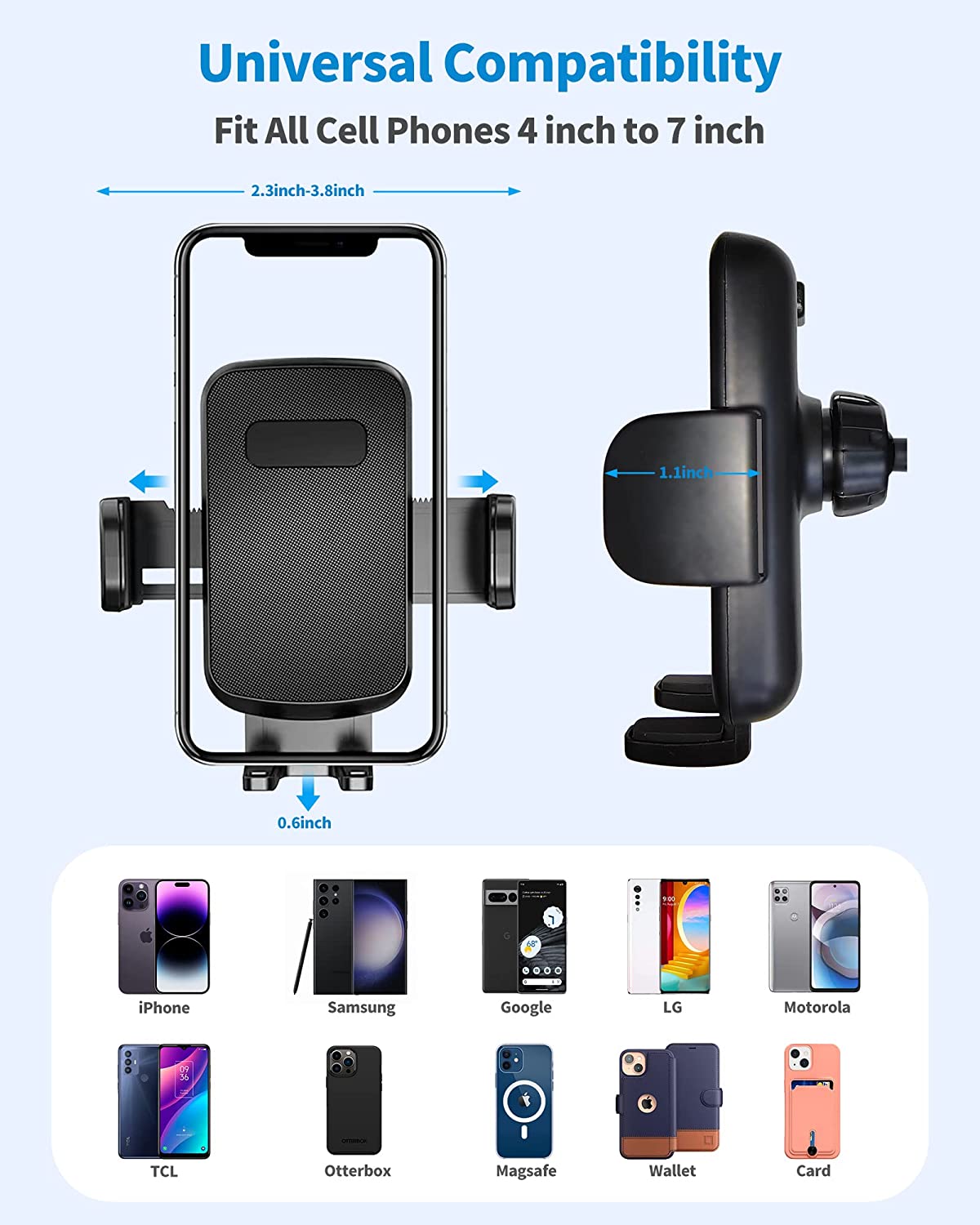 • 【Easy to Operate】The phone mount for car is easy to operate and can be operated by one hand. Press the button on the back of the car mount to open the clip with one click, and push the clip with one hand after placing the phone. This phone holder for car is suitable for 4-7 inch mobile phones, including all mobile phones with cases.