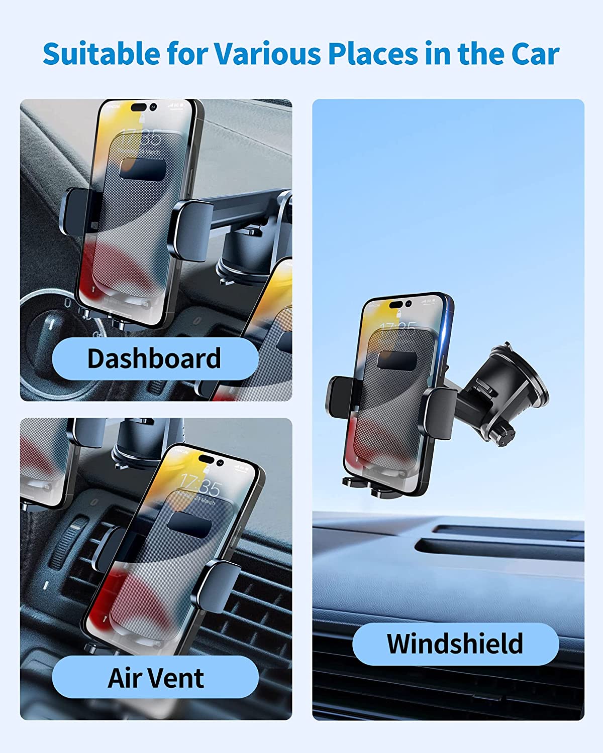 • 【3 in 1 Car Mount】The car phone holder can be used in the car dashboard, air vent and windshield. Car phone holder has multiple purposes, more convenient, and meets more needs in the car.