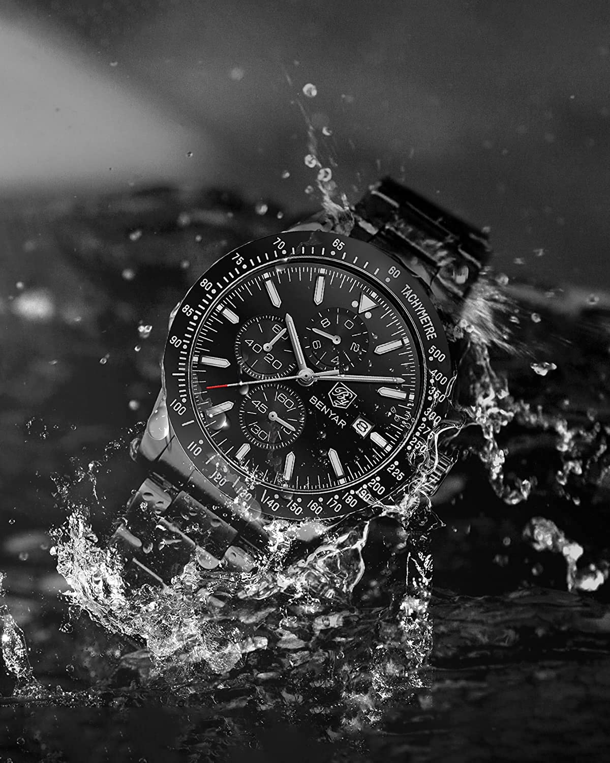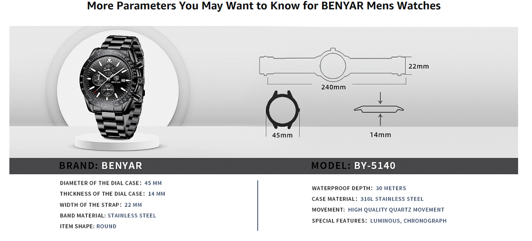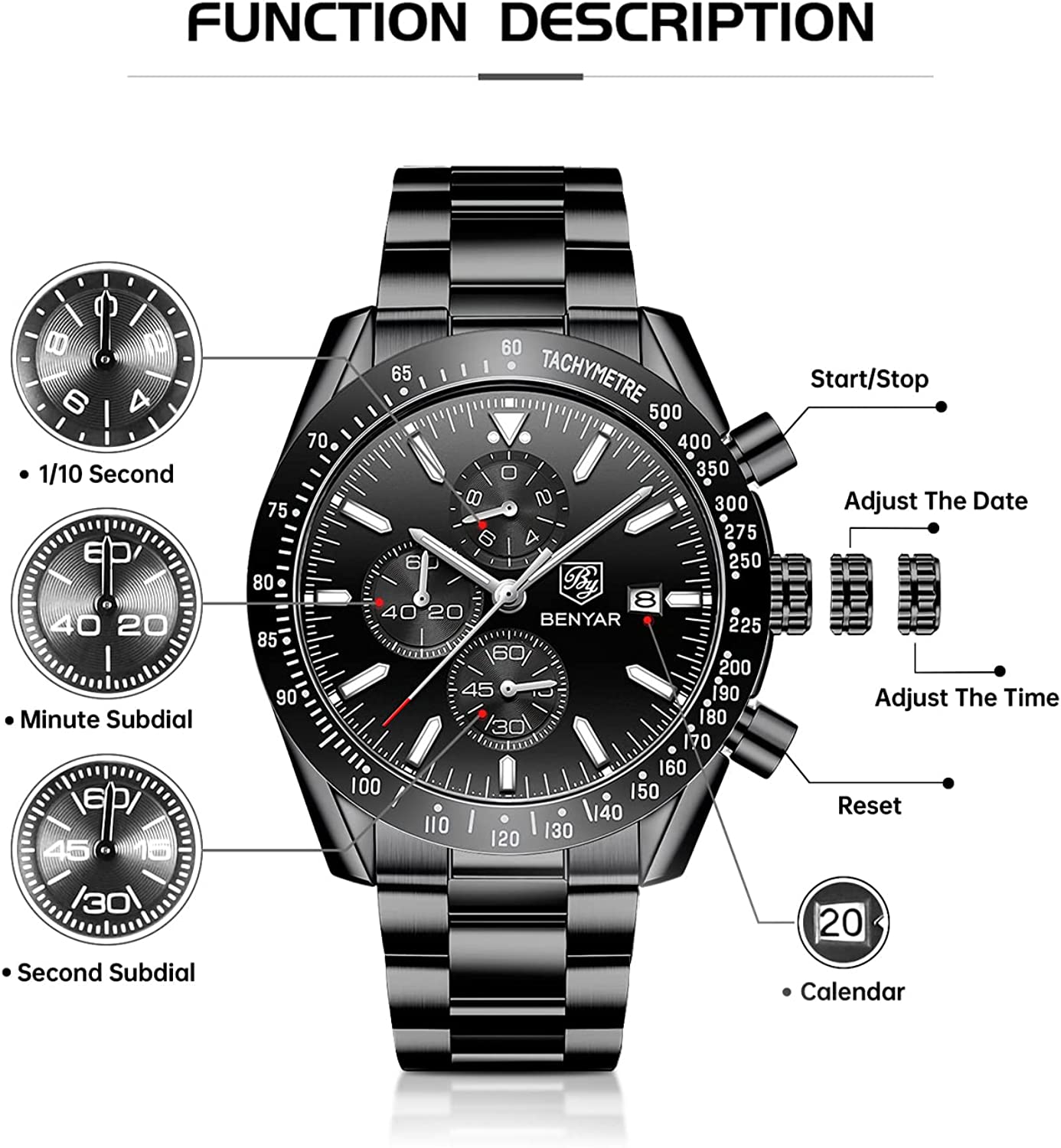 - ⌚ ELEGANT DESIGN: BY BENYAR offers a wide range of stylish luxury wrist watches specially crafted for men. The watch comes with 100% strong glass, black dial and tachymeter topring. The genuine stainless steel band with width 2.2cm and length 22cm give the watch a classy look. It is a multi-function chronograph with three sub-dial for second, minute and hour.