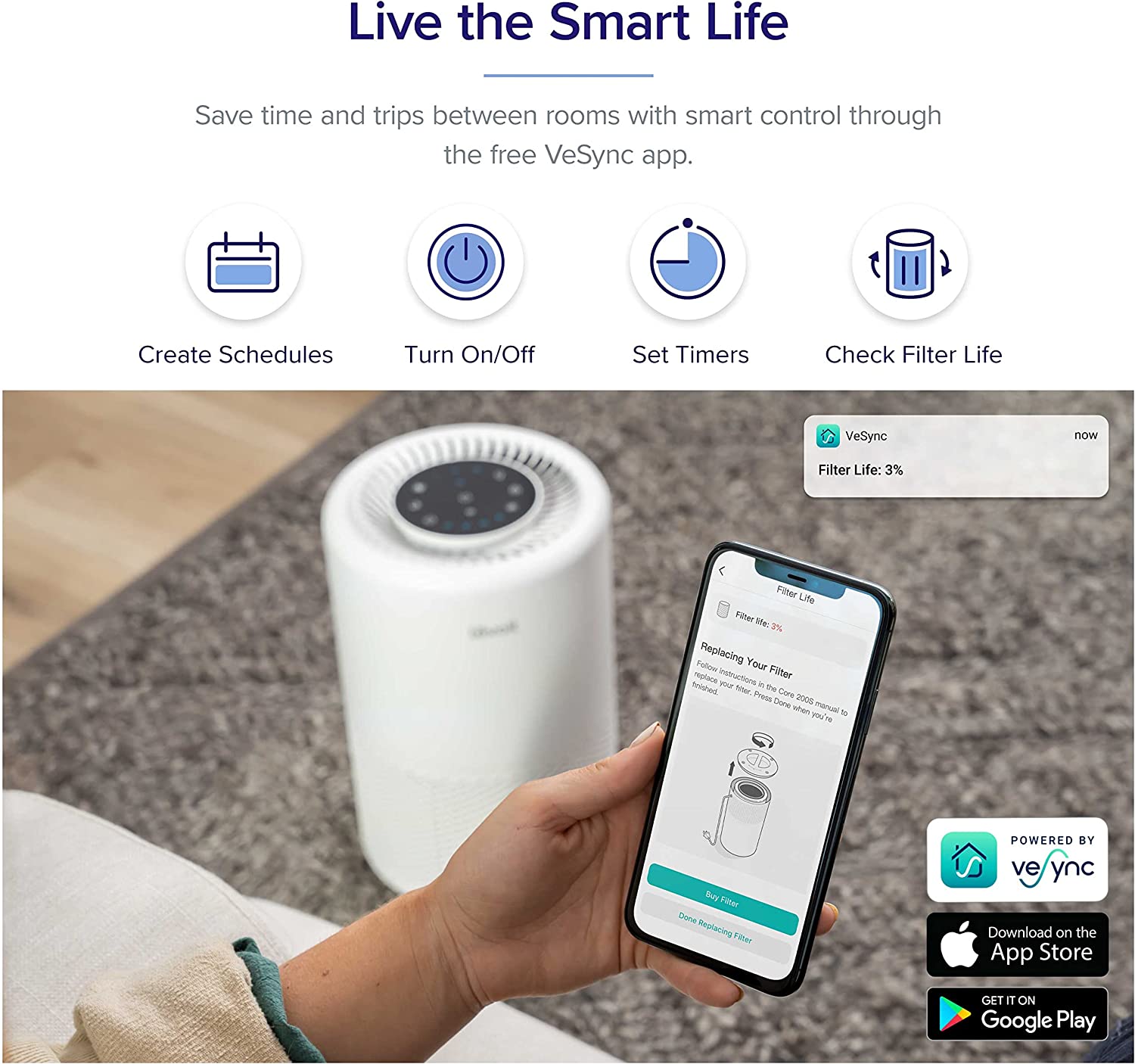 - GENUINE REPLACEMENT FILTERS: For the best performance and longest lifespan, use genuine Levoit replacement filters. Use the in-app feature to monitor your filter life. When it’s time for a fresh filter, search “Core 200S-RF”