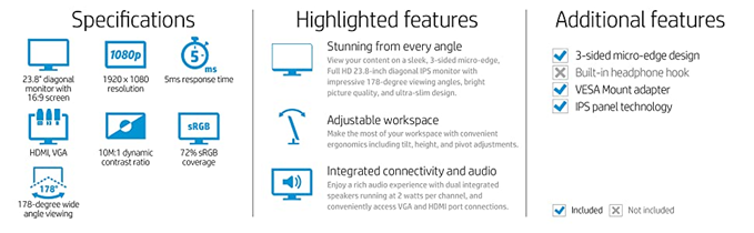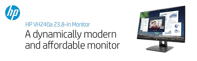 Get the best productivity from home or at the office with the virtually borderless HP VH240a 23.8-Inch display featuring an ergonomic stand, built-in speakers and an ultra-slim design at a competitively low price point. Great for projects requiring portrait and landscape mode screen rotation, the VH240a also includes a 178° positional viewing angle for the best quality no matter where you sit. You can also mount the display on a wall or arm bracket with a 100m VESA mounting pattern located on the back of the monitor arm. Connect your Windows, Mac, or any laptop featuring an HDMI port with an included HDMI cord. The video card of the connected PC must be capable of supporting 1920 x 1080 at 60 Hz and include 1 HDMI or 1 VGA output to drive the monitor at the preferred mode.