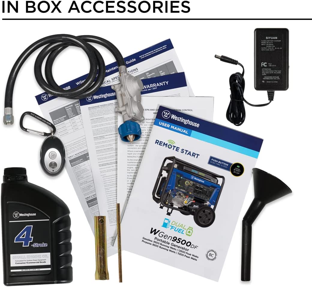 The Westinghouse WGen9500DF Dual Fuel Portable Generator produces up to 12,500 peak watts and 9,500 running watts. The WGen9500DF is a dual fuel generator that operates on gasoline or propane (LPG). The heavy duty 457cc 4-Stroke OHV Westinghouse Engine is constructed of a durable cast iron sleeve and runs for up to 12 hours on a 6.6 gallon (25 L) gas tank, keeping you powered through the day with built-in fuel gauge, automatic low oil shutdown, and GFCI outlets. Push-Button Electric Start makes starting the WGen9500DF effortless while the remote start key fob offers added ease from a distance. Its intuitive control panel spotlights the Transfer Switch Ready L14-30R and larger 14-50R to power your major appliances like the air conditioner, refrigerator, and sump pump as well as any lights or entertainment centers all at the same time with a single cord hookup. VFT Data Center displays volt output, frequency, and lifetime hours to keep you up to date with real-time information and regular maintenance. Conveniently portable with an included set of heavy duty never-flat wheels, handle, and lift bracket, it'll have your house, travel trailer, or jobsite powered in seconds. The WGen9500DF is complete with a 3-Year Limited Warranty and Lifetime Technical Support backed by our nationwide customer service and support network.