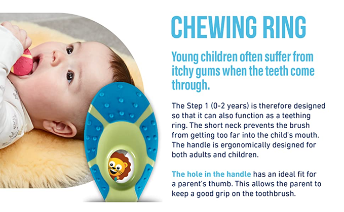 - TAILOR MADE - Step 1 toddler toothbrush step 1 toothbrush is tailor-made to make the first brushing experience a good one. The short neck and it`s unique teeth ring prevent to swallow or prick when brushing