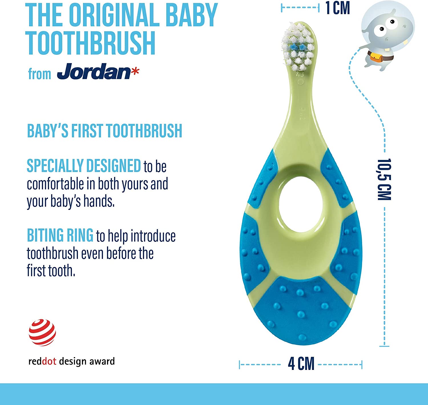 - MADE FOR YOUR BABY - Jordan* is the original brand of this infant toothbrush designed with extra soft bristles, a soft biting ring for babies gums, and a handle that suits adults and babies